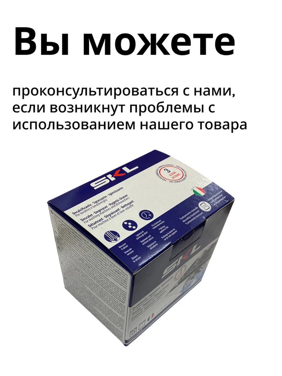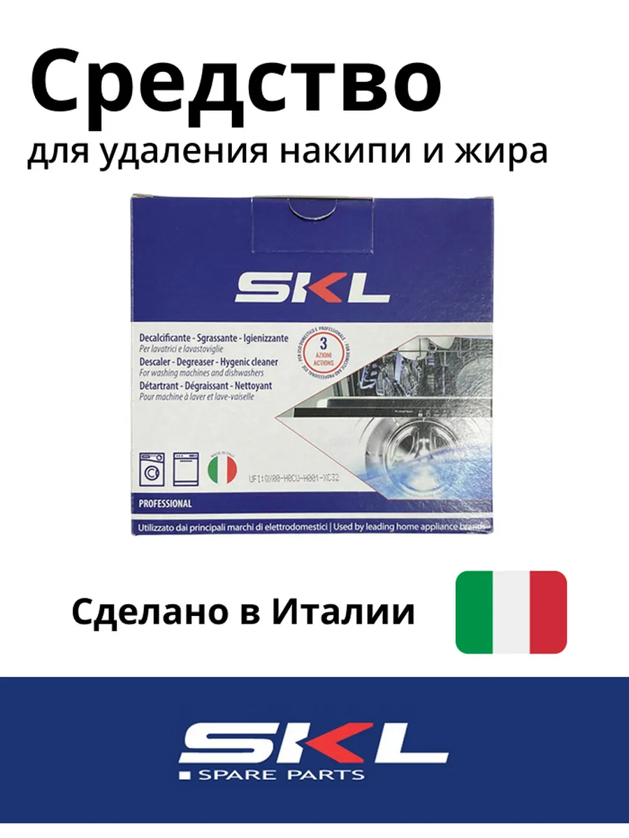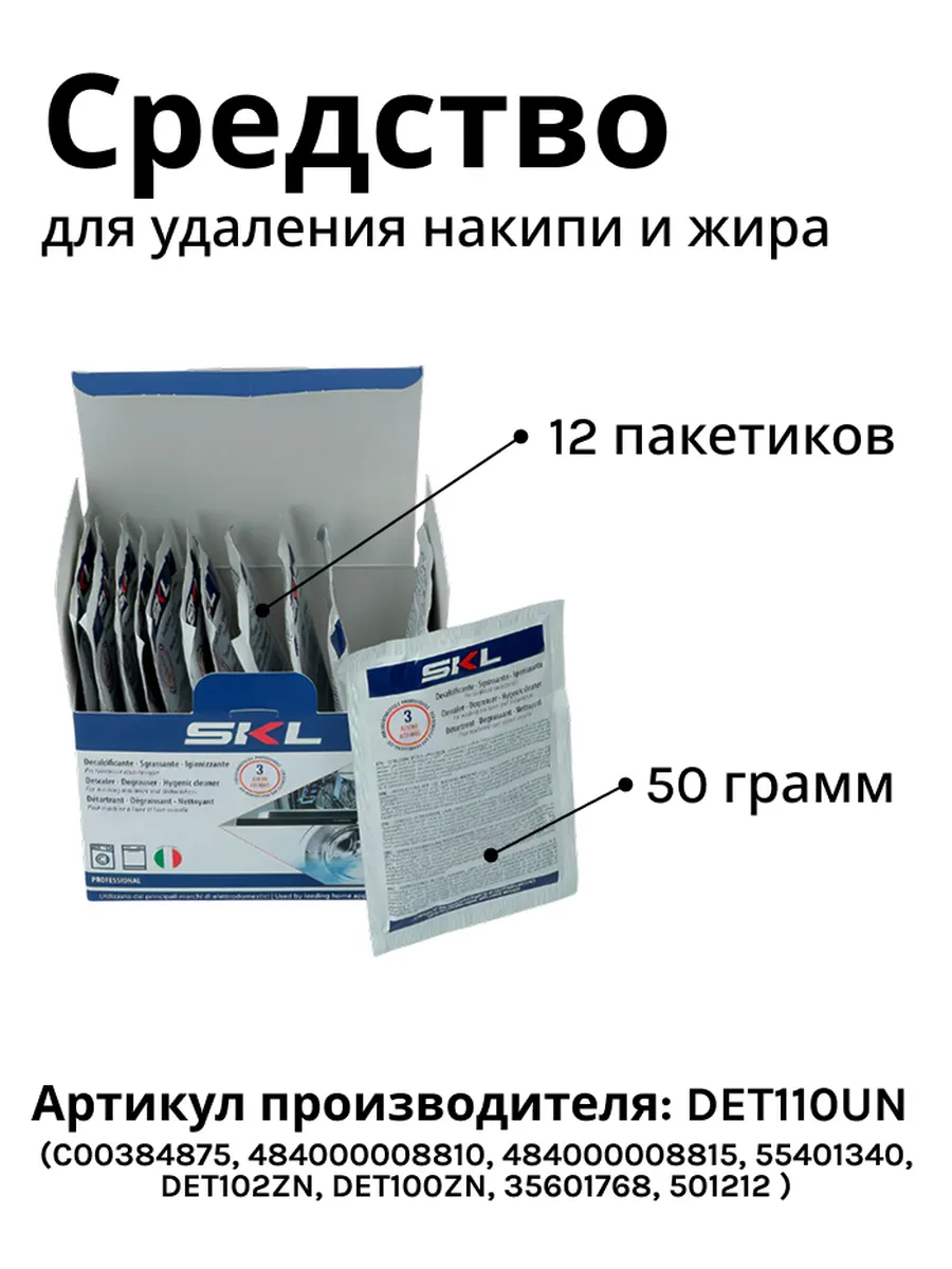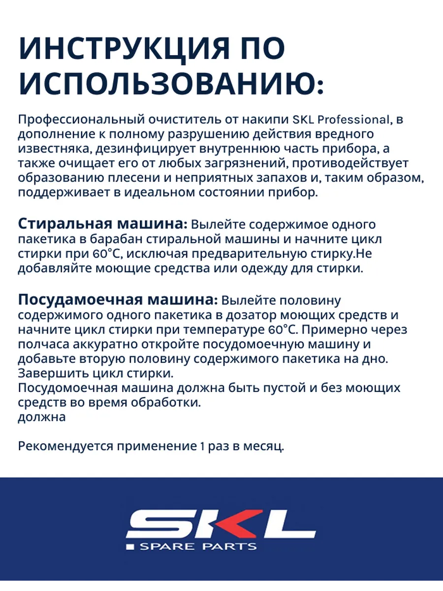 Средство от накипи для стиральных и посудомоечных машин SKL Professional. Является аналогом WPRO от накипи. C00384875, 4840 0000 8810, 4840 0000 8815, 55401340, DET102ZN, DET100ZN, 35601768. Каждый день на внутренних деталях Вашей техники в процессе эксплуатации оседает накипь. Данное соединение уменьшает функциональность техники, оксида на ТЭНе (нагревательном приборе), помпе и т.д , а так-же даже может привести к поломке. Для того чтобы этого не произошло необходимо систематически чистить технику. Одно из качественных и безопасных средств является средство от накипи для стиральных и посудомоечных машин SKL. Данный профессиональный очиститель , кроме полного разрушения вредного известняка, дезинфицирует внутреннюю часть прибора, а так же очищает его от любых загрязнений, избавляет от плесени и неприятных запахов, таким образом Ваш прибор будет в идеальном состоянии. В упаковке 12 пакетиков, хватит на год использования. Способ применения: 1). Стиральная машина: Вылейте, содержимое одного пакетика в барабан стиральной машины и начните цикл стирки при температуре 60С, исключая предварительной стирки. Не добавляйте моющие средства или одежду для стирки. 2). Посудомоечная машина: Вылейте половину одного пакетика в дозатор моющих средств начните цикл мытья при температуре 60С. Примерно через пол часа, аккуратно откройте посудомоечную машину и добавьте вторую половину содержимого пакетика на дно. Завершить цикл мытья. Посудомоечная машина должна быть пустой и без моющих средств во время обработки. Рекомендуется применять 1 раз в месяц.