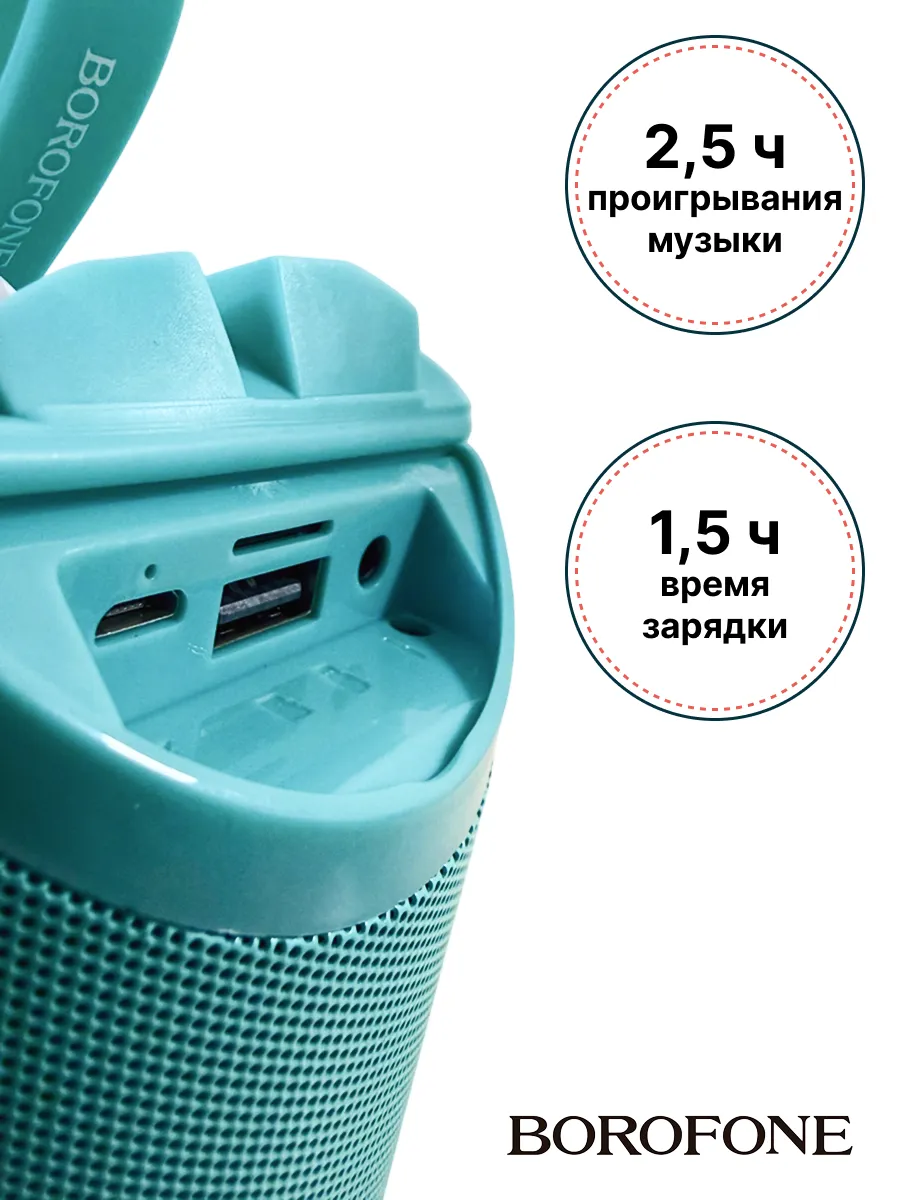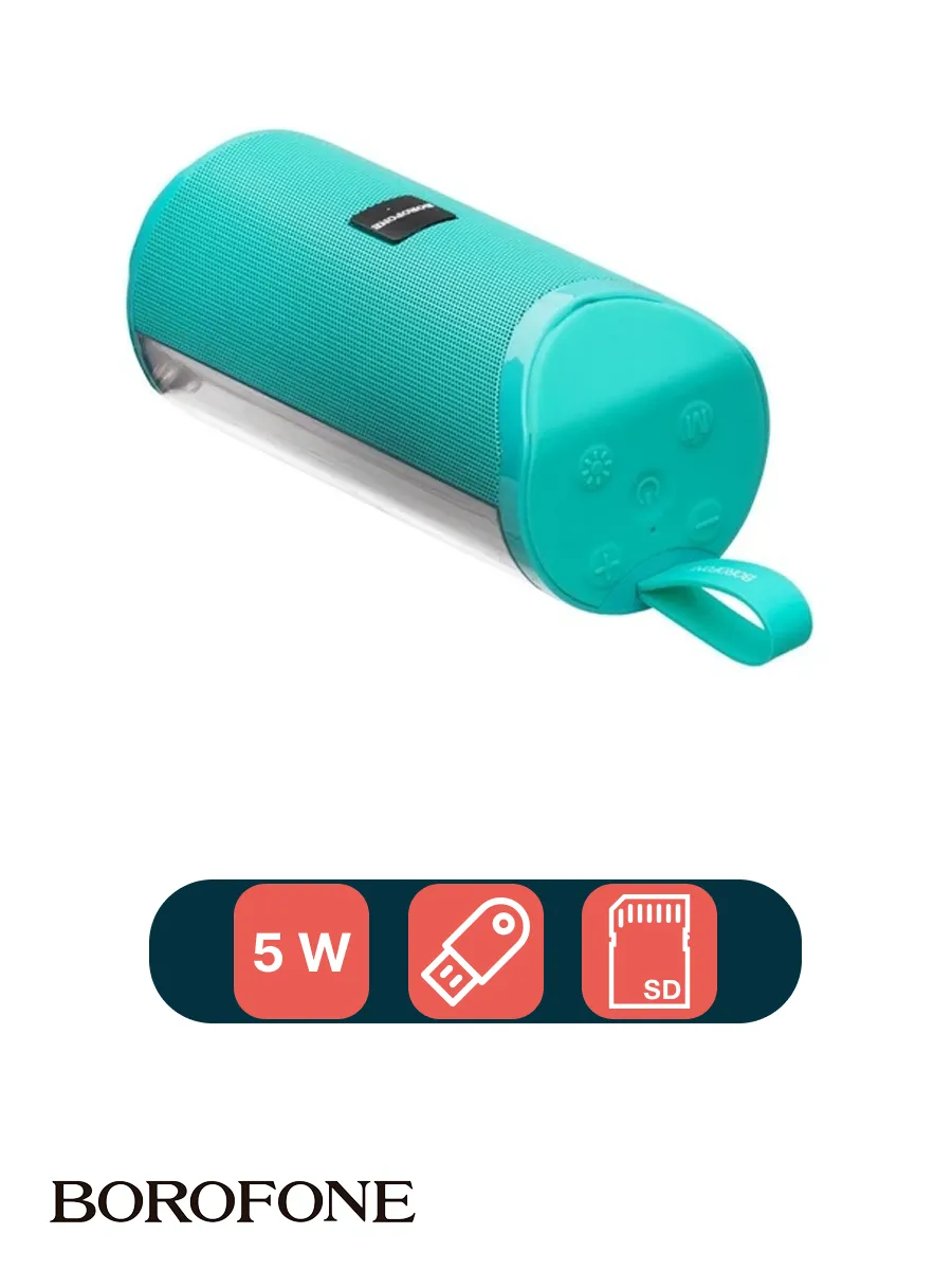Портативная акустическая колонка BOROFONE BR5 с уникальной переключаемой LED-подсветкой позволит не только услышать, но и увидеть музыку! Имеет степень защиты от влаги уровня IPX5, поэтому ей не страшны брызги и капли дождя. Передает весь спектр звуковых частот, включая глубокие басы. Кроме беспроводного соединения через Bluetooth v.5.0 поддерживает воспроизведение с карт памяти Micro SD, USB-накопителей и через AUX-кабель. Имеет встроенное FM-радио. Доступна функция звонков с помощью встроенного микрофона. Благодаря аккумулятору ёмкостью 1200 mAh работает в режиме воспроизведения 2,5 часа без подзарядки, заряжается за 1,5 часа. Корпус из прочного пластика весит всего 400 грамм и оснащен ремешком для ношения. Все контактные разъемы и слоты удобно располагаются сверху корпуса и герметично закрыты резиновой заглушкой. Модель укомплектована кабелями Micro-USB и AUX.Колонка с чистым, мощный звуком и яркой подсветкой позволит Вам создать праздник в любом месте и в любое время!