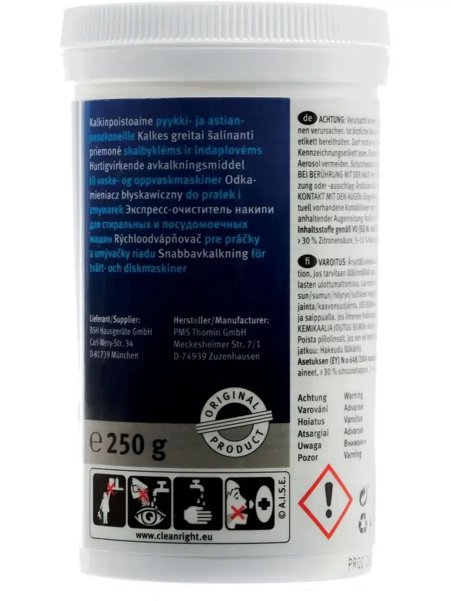 Средство от накипи BOSCH 00311919 (00311918) для стиральных и посудомоечных машин предназначено для удаления накипи и известковых отложений, которые могут образовываться внутри машин в результате использования жесткой воды. Это средство обычно поставляется в виде порошка или жидкости и содержит химические компоненты, способные разрушать и удалять накипь.