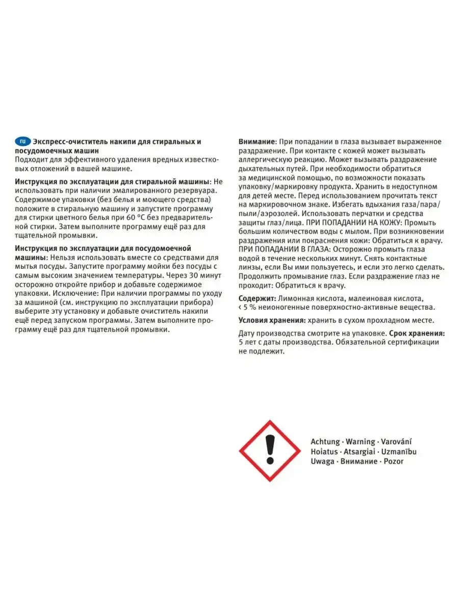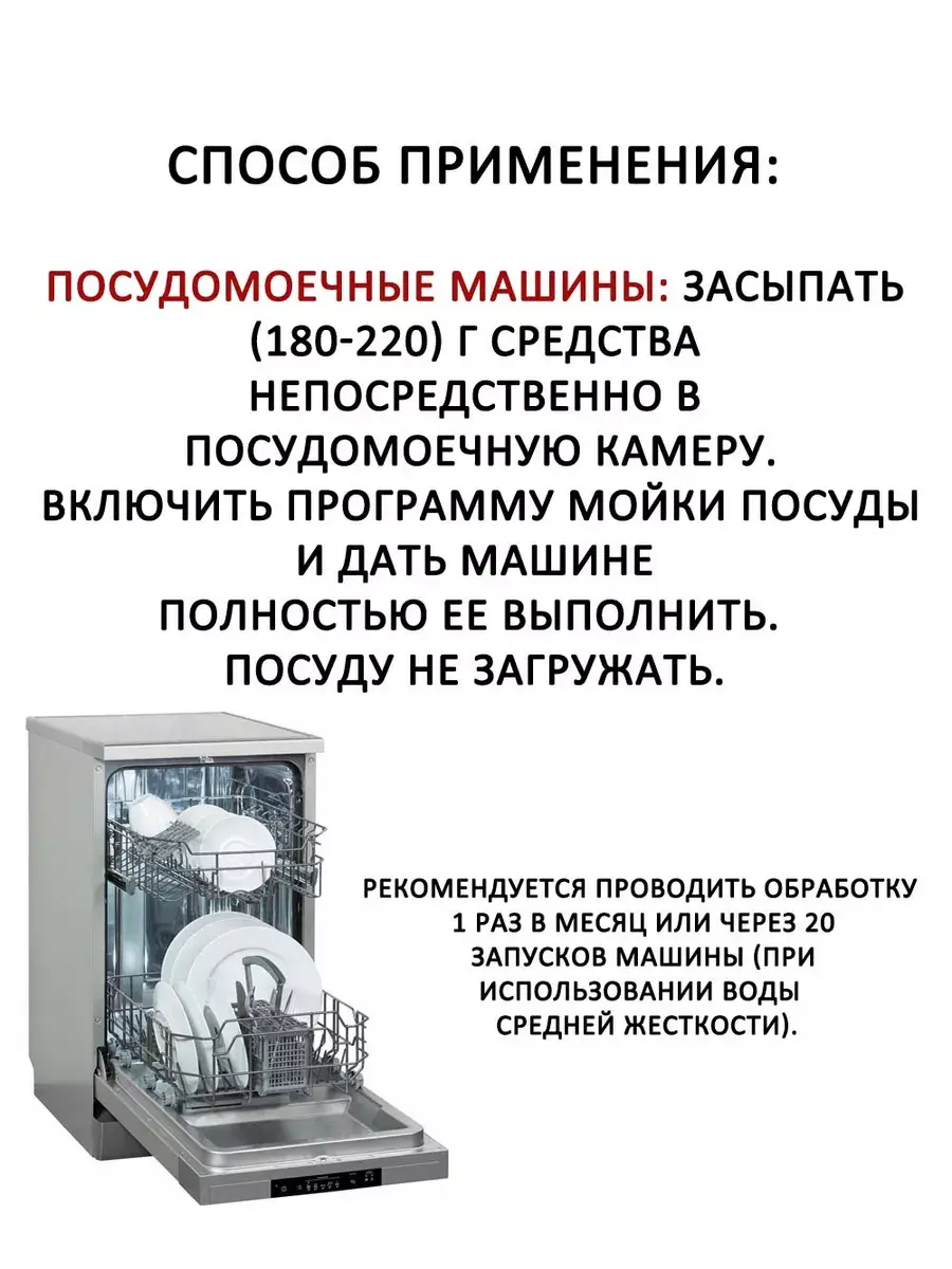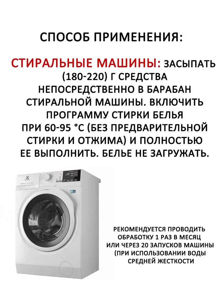 Это средство помогает сохранить эффективность работы машин, продлевает их срок службы и улучшает качество стирки и мытья посуды за счет удаления накипи, которая может привести к плохому качеству стирки или мытья, а также к поломкам оборудования.