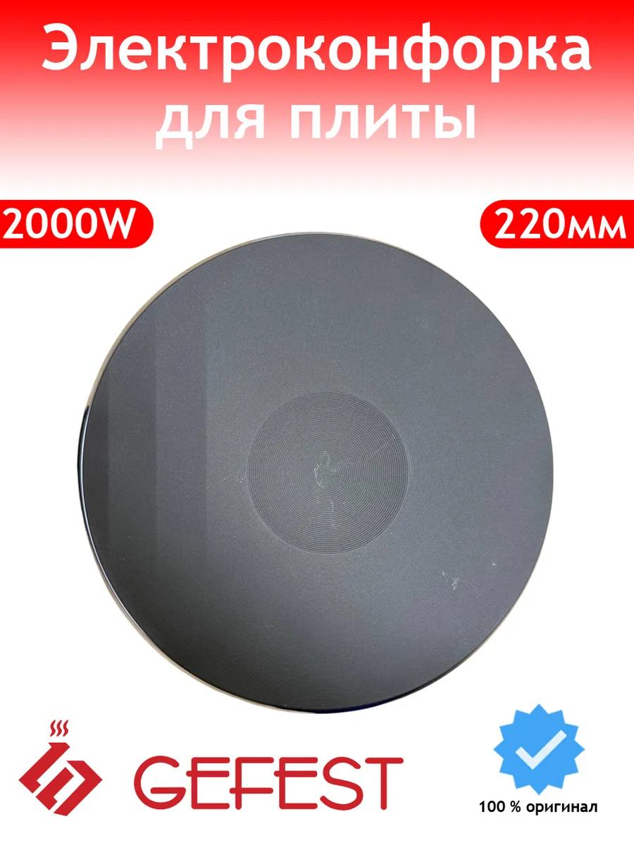 Посадочный диаметр: 220 мм. Диаметр блина: 228 мм. Мощность конфорки: 2000 Вт. Кол-во контактов подключения: 4 шт. (1-2-4-3). Конфорка для электроплиты HP-F220. Поставляется напрямую с завода Gefest. Электрическая конфорка ЭКЧ 220 имеет мощность 2 кВт ( 2000 W ватт ), диаметр (D) 220 мм, напряжение: 230 V вольт. Материал: чугун. Диаметр поверхности от края до края: 235 мм. Толщина чугунной части: 22 мм.