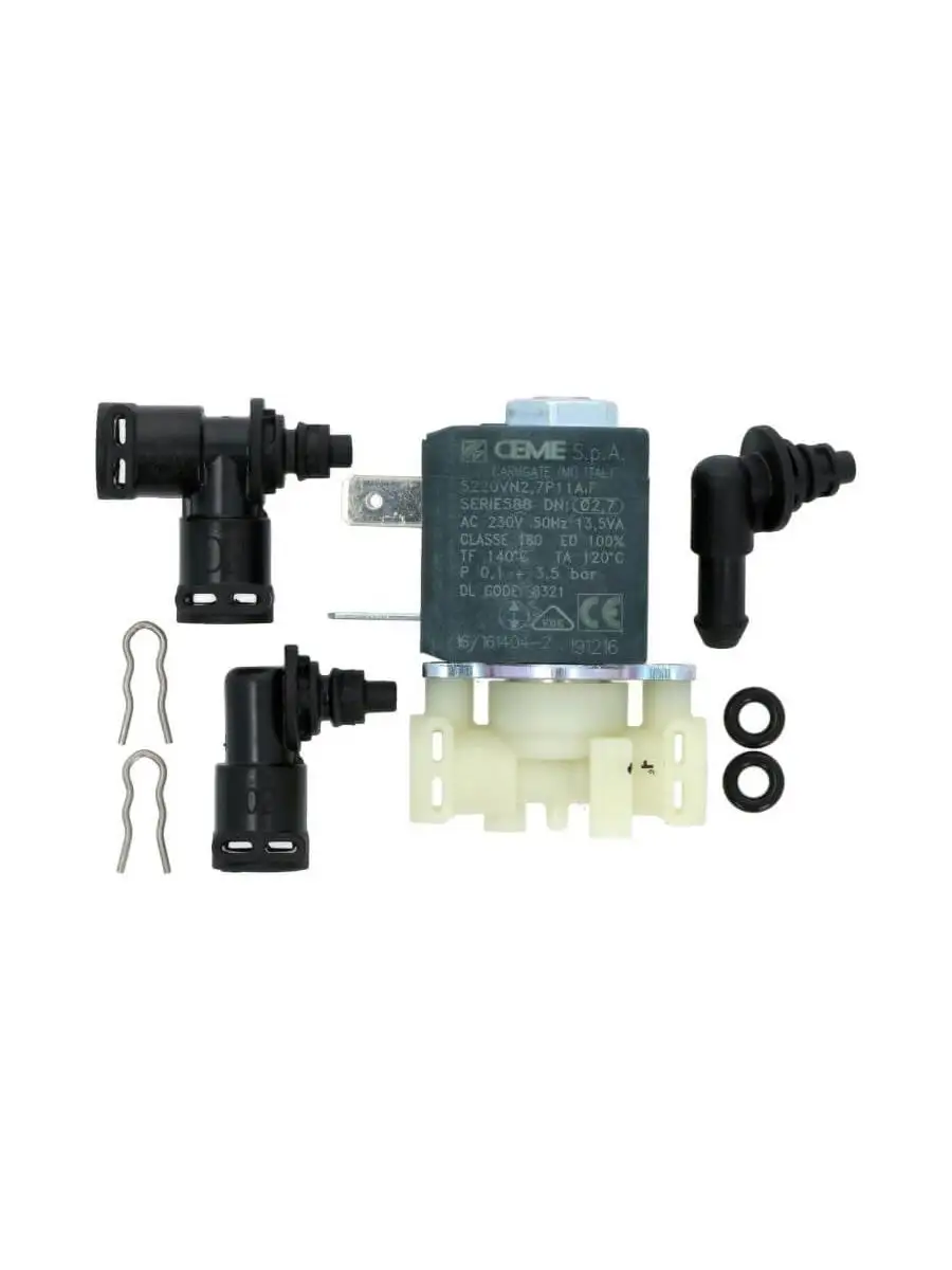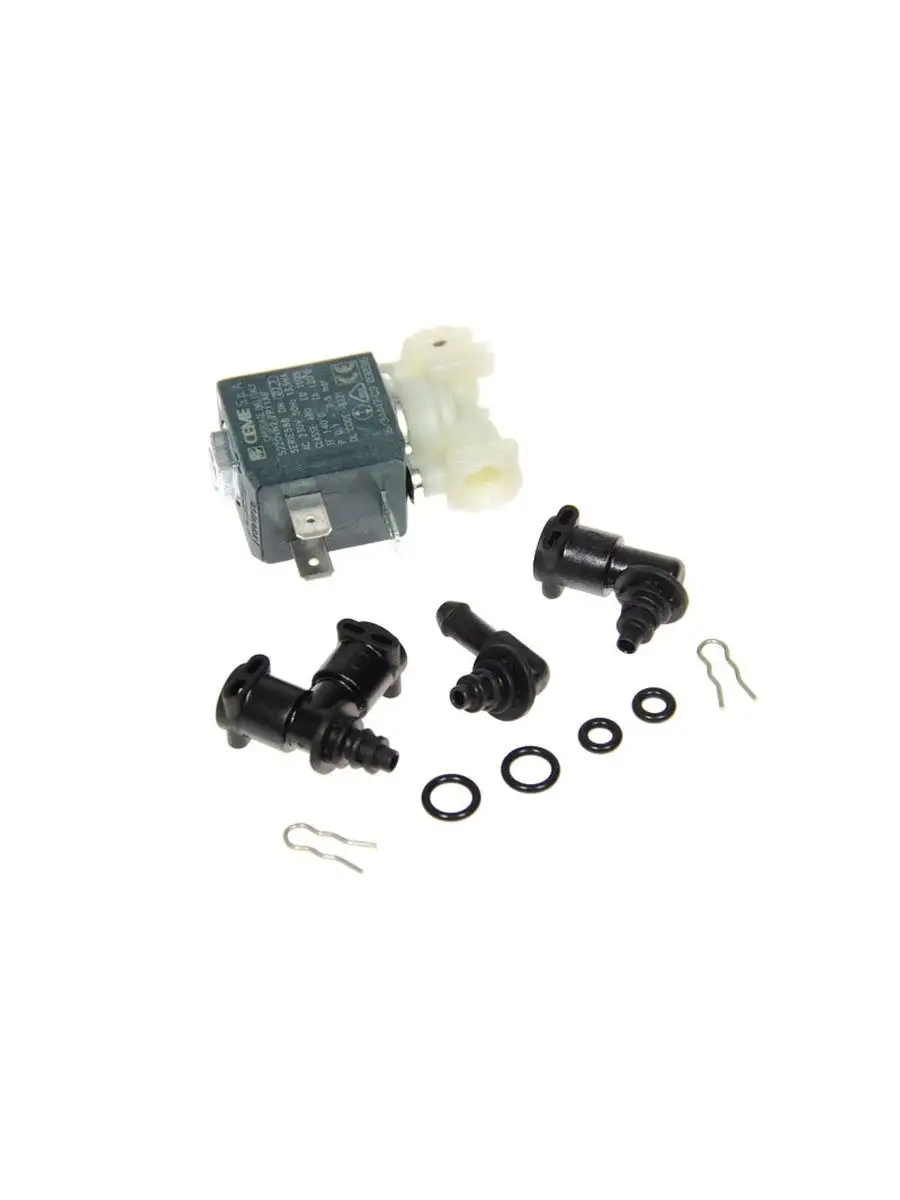 Оригинальный электромагнитный клапан DeLonghi (Италия) предназначен для контроля давления насоса в кофемашинах. Комплект включает сам клапан, 3 переходника, 4 прокладки и 2 скобы, что обеспечивает полную готовность к установке.