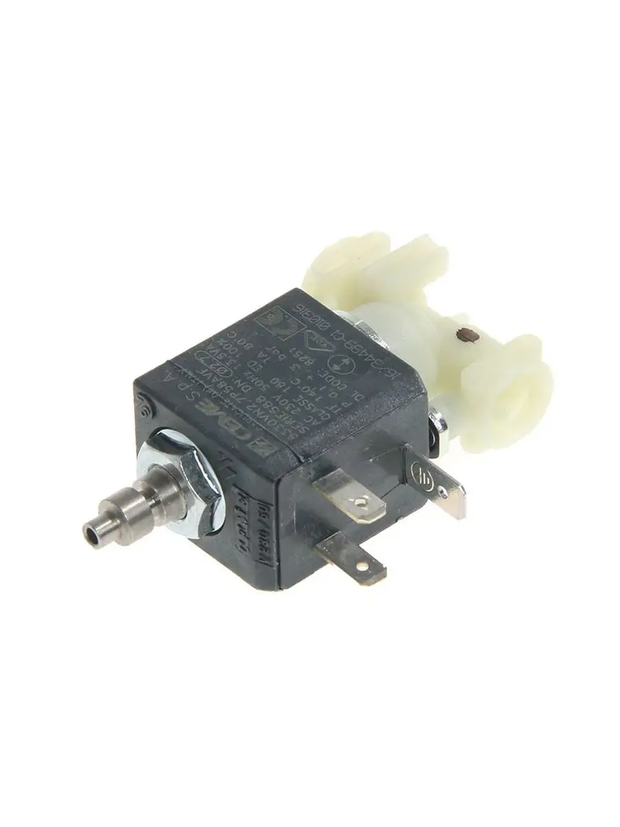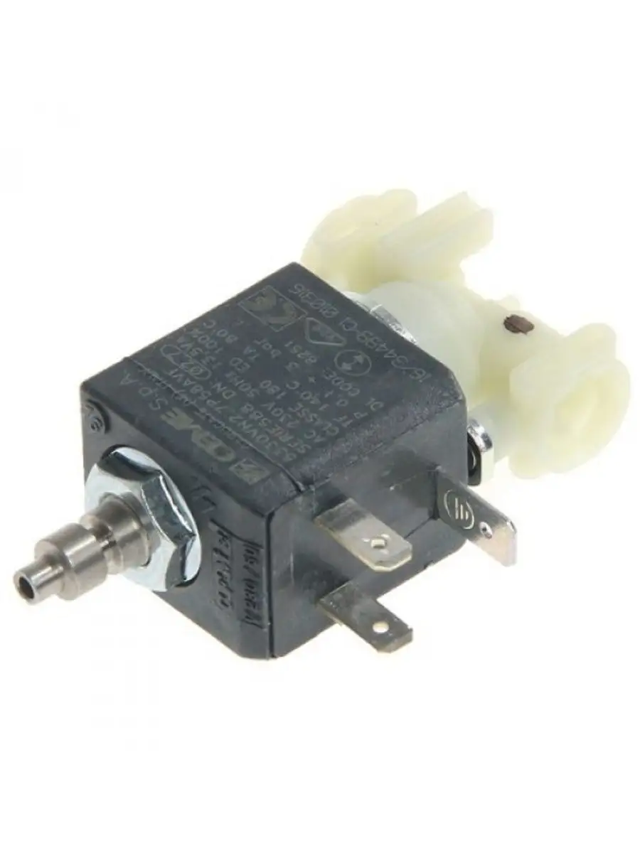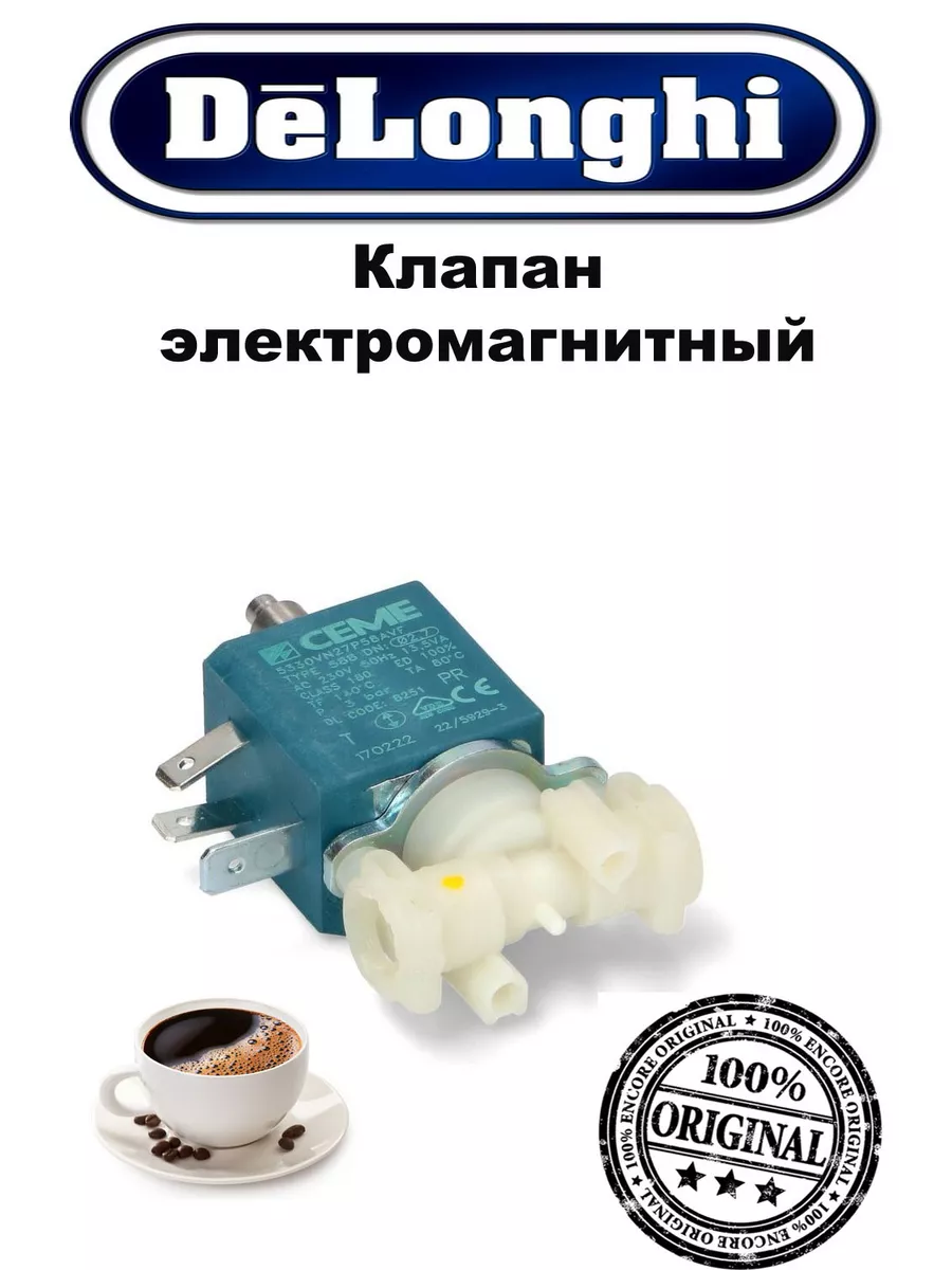Клапан электромагнитный для кофемашины DeLonghi 5213218251. Оригинальный клапан от компании DeLonghi. Код замены: 5213214171, 5213215961, 5213220251. Напряжение: 230В. Полная мощность: 13,5 ВА. Клапан электроманитный 3П (3-х ходовой). Электромагнитный клапан, с помощью которого обеспечивается циркуляция воды и пара в гидросистеме, поддерживается оптимальная температура. Клапан обеспечивает сброс избытка давления воды (пара) в контуре при отключении. С его помощью можно или перекрыть магистраль, или обеспечить движение горячей воды к капучинатору или диспенсеру. Следует различать двухходовой и трехходовой клапан кофемашины — в зависимости от модели устройства. Перед заказом уточняйте совместимость с Вашим прибором.