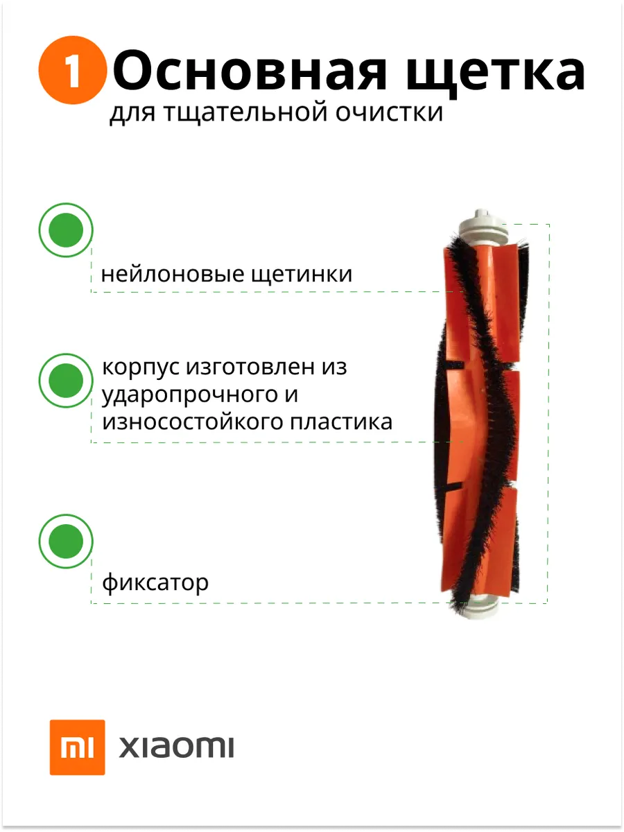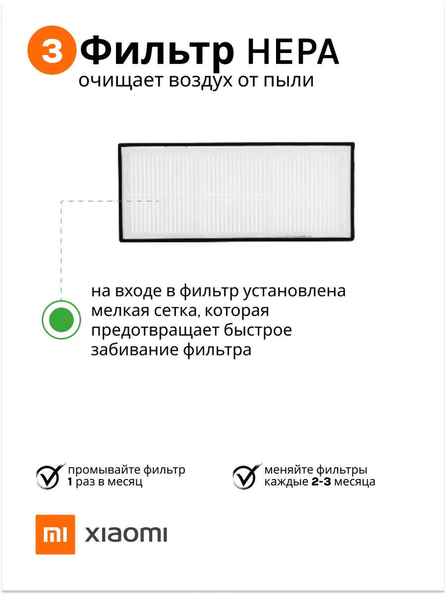 Комплект состоит из одной основной щетки, двух боковых щеток, двух фильтров HEPA и инструмента для чистки волос. Основная щетка имеет V-образную форму ворса, благодаря которой собранная грязь перемещается в центр пылесоса, откуда мощный поток воздуха засасывает её в пылесборник. Ворсинки щетки выполнены из износостойкого нейлона, но достаточно мягкие, чтобы предотвратить повреждение напольного покрытия. Боковые щетки отлично собирают пыль и мусор в углах и у стен. Щетки сделаны из ударопрочного пластика и износостойкого нейлона. Не царапают пол, стены, мебель. Фильтр HEPA для робота-пылесоса Xiaomi – это высокоэффективный элемент, предназначенный для очистки воздуха от пыли, аллергенов и микрочастиц, обеспечивая более чистую и здоровую атмосферу в вашем доме. Этот фильтр является важной частью системы фильтрации, позволяя вашему роботу-пылесосу работать на максимальной мощности и эффективно справляться с загрязнениями.