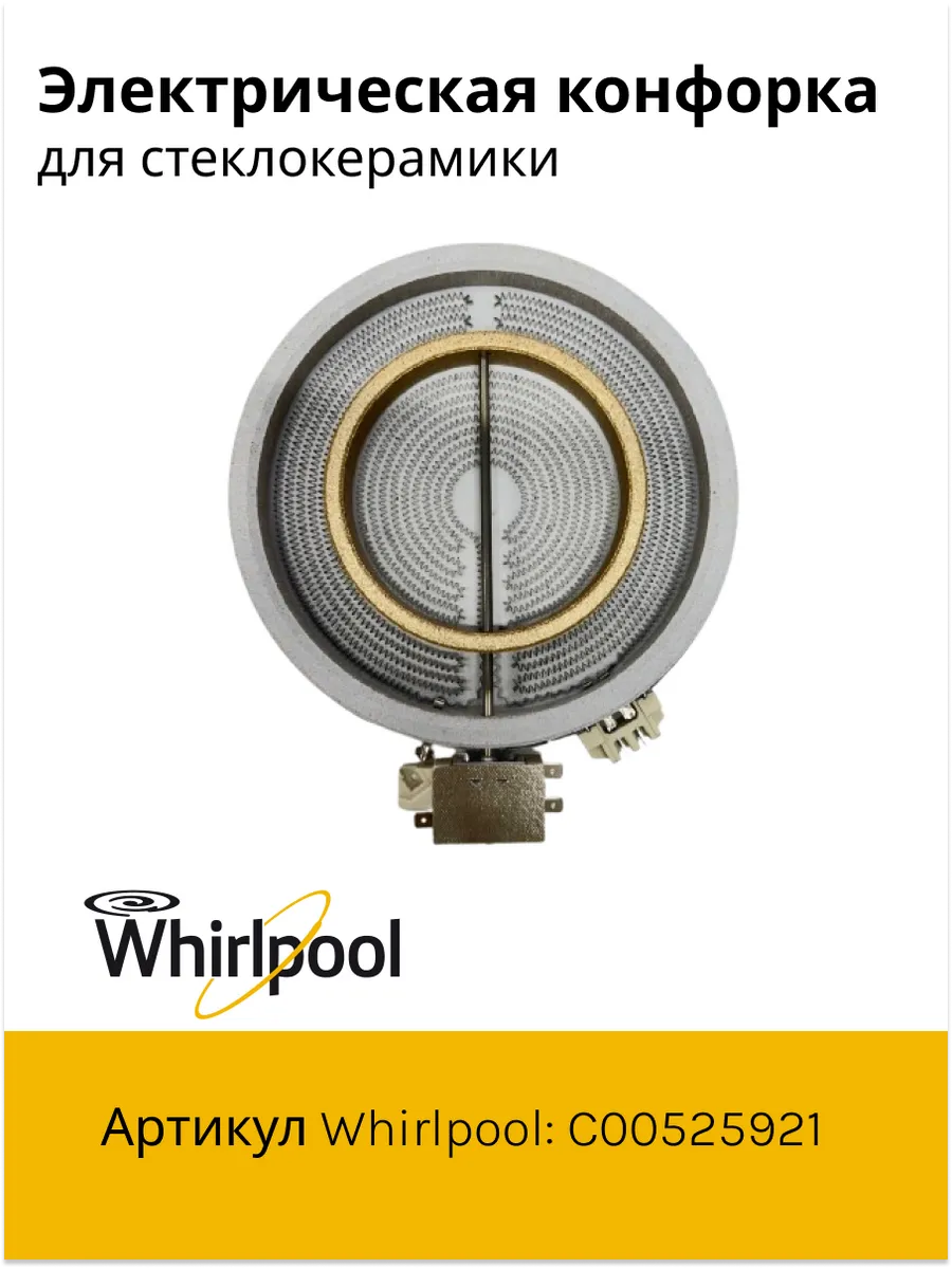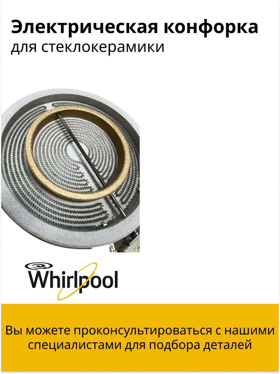Электрическая конфорка для стеклокерамики Whirlpool – это высококачественный и надежный компонент, предназначенный для использования в современных кухонных плитах. Она обеспечивает эффективное и равномерное нагревание, что делает процесс приготовления пищи быстрым и удобным.