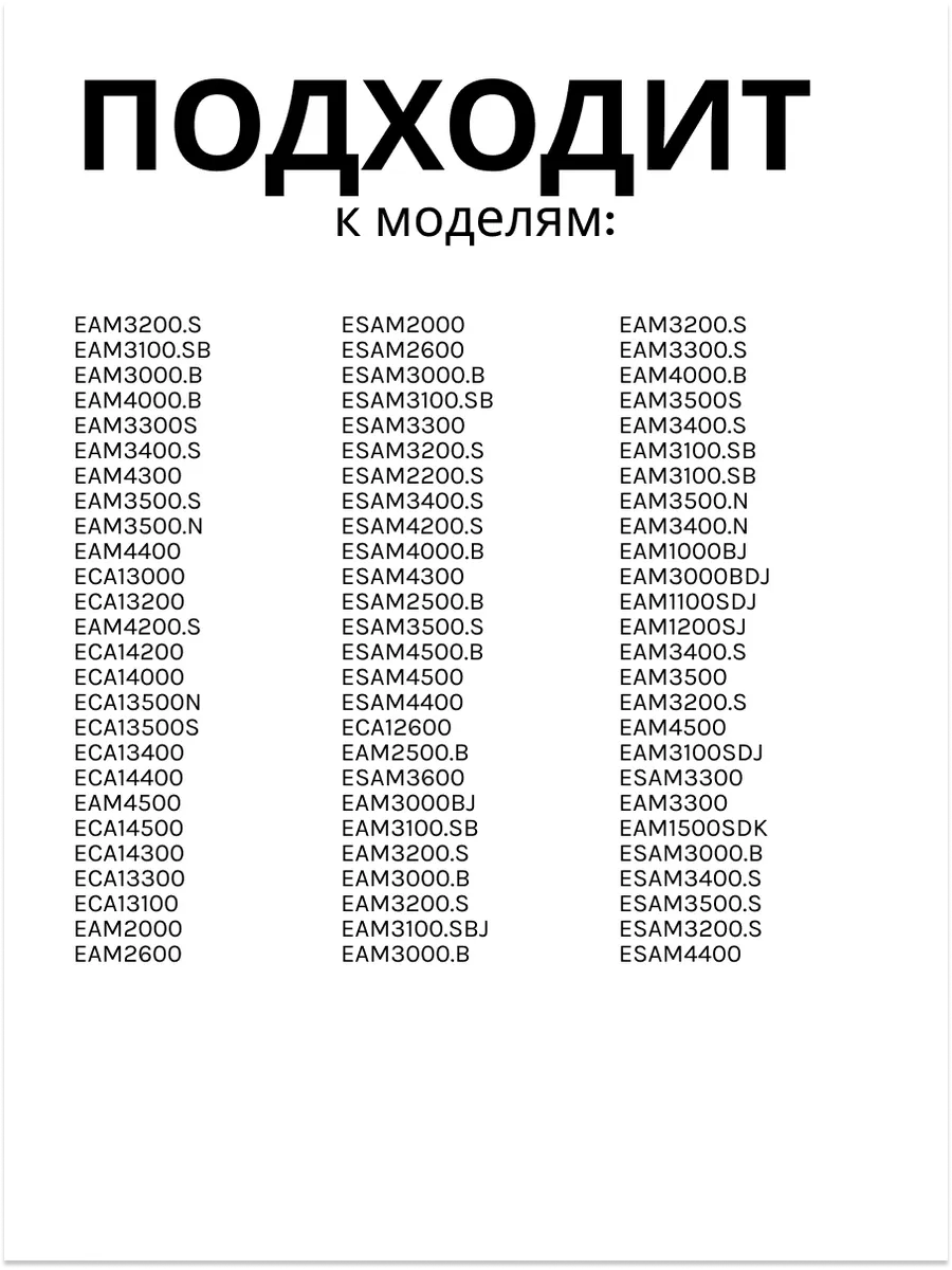 EAM1000, EAM1000BJ, EAM1100SDJ, EAM1200SJ, EAM1500, EAM1500SDK, EAM2000, EAM2500B, EAM2600, EAM3000B, EAM3000BDJ, EAM3100SB, EAM3100SBJ, EAM3100SDJ, EAM3200S, EAM3250, EAM3300S, EAM3400S, EAM3500S, EAM3500N, EAM4000B, EAM4200S, EAM4300, EAM4400, EAM4500, ESAM2000, ESAM2200S, ESAM2600, ESAM2800SB, ESAM2900, ESAM3000B, ESAM3100SB, ESAM3200S, ESAM3240O, ESAM3300, ESAM3350, ESAM3400R, ESAM3500N, ESAM3600, ESAM4000B, ESAM4200S, ESAM4400S, ESAM4500, ESAM4500US, ESAM4500.110V, ECA12600, ECA13000, ECA13200, ECA13400, ECA13500N, ECA13500S, ECA14000, ECA14200, ECA14300, ECA14400, ECA14500.