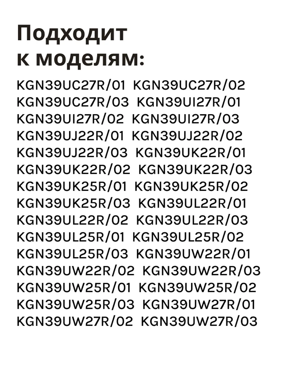 Подходит к моделям: KGN39UC27R/01 KGN39UC27R/02 KGN39UC27R/03 KGN39UI27R/01 KGN39UI27R/02 KGN39UI27R/03 KGN39UJ22R/01 KGN39UJ22R/02 KGN39UJ22R/03 KGN39UK22R/01 KGN39UK22R/02 KGN39UK22R/03 KGN39UK25R/01 KGN39UK25R/02 KGN39UK25R/03 KGN39UL22R/01 KGN39UL22R/02 KGN39UL22R/03 KGN39UL25R/01 KGN39UL25R/02 KGN39UL25R/03 KGN39UW22R/01 KGN39UW22R/02 KGN39UW22R/03 KGN39UW25R/01 KGN39UW25R/02 KGN39UW25R/03 KGN39UW27R/01 KGN39UW27R/02 KGN39UW27R/03.