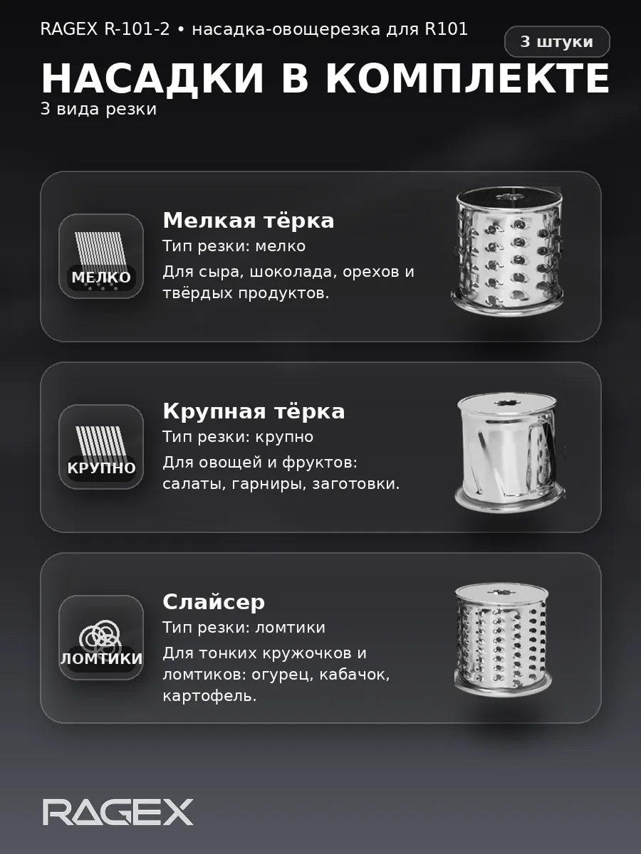 Комплект насадок-овощерезок представляет собой универсальный набор сменных барабанчиков-насадок для кухонных комбайнов Ragex R101 (варианты R101-200, R101-600, R101-900), Ragex R105, Ragex R106. Он позволяет быстро и удобно нарезать и измельчать овощи, фрукты и другие продукты, превращая подготовку ингредиентов в лёгкую и эффективную задачу.