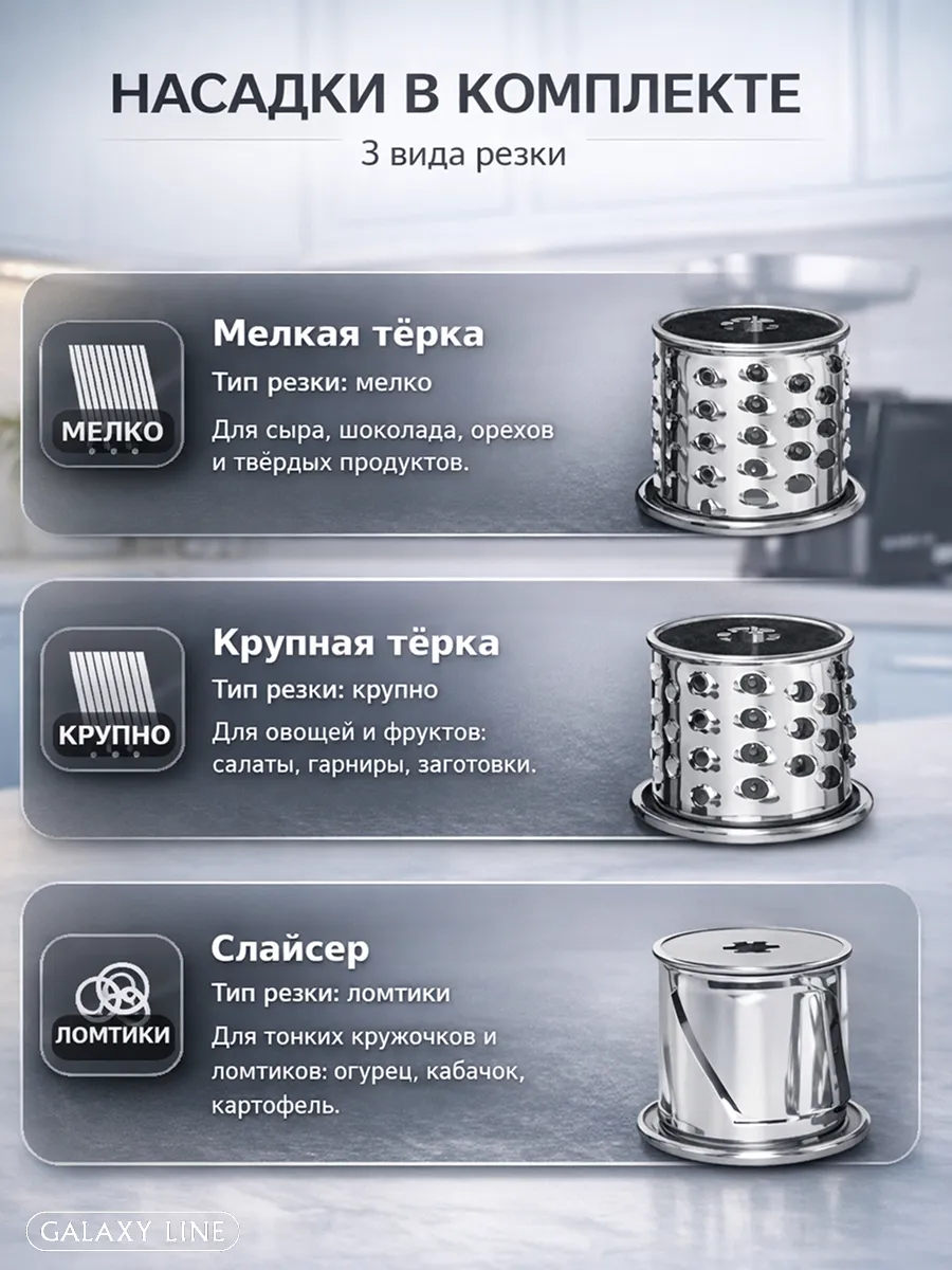 Комплект включает три режущие насадки — мелкая терка, крупная терка и слайсер, что расширяет возможности техники и делает её ещё универсальнее на кухне.