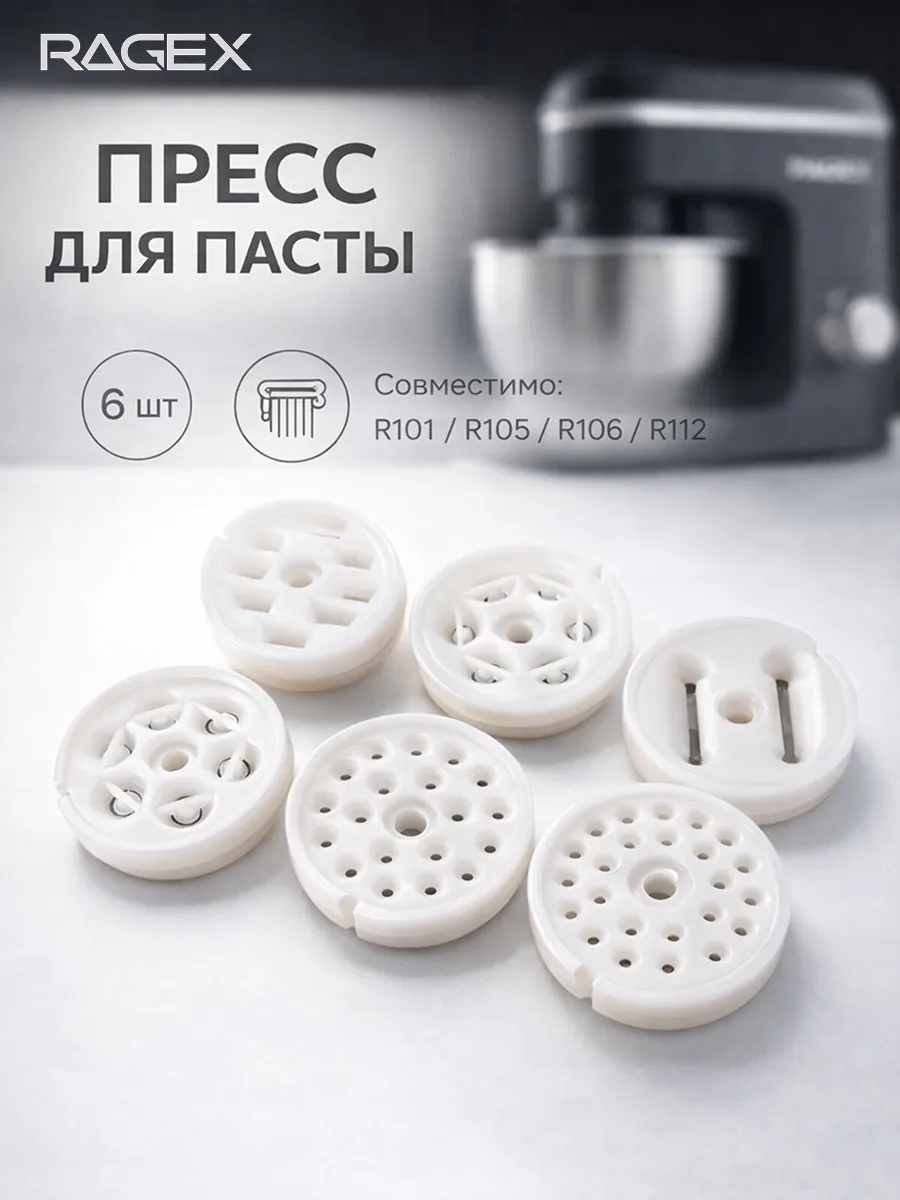 Комплект пресс-насадок предназначен для приготовления различных видов пасты: паппарделле, фетучини, спагетти, букатини, маккерони и ригатони. Формовочные диски для макарон устанавливаются вместо диска мясорубки.