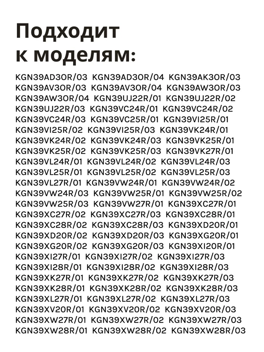 Подходит к моделям: KGN39AD3OR/03 KGN39AD3OR/04 KGN39AK3OR/03 KGN39AV3OR/03 KGN39AV3OR/04 KGN39AW3OR/03 KGN39AW3OR/04 KGN39UJ22R/01 KGN39UJ22R/02 KGN39UJ22R/03 KGN39VC24R/01 KGN39VC24R/02 KGN39VC24R/03 KGN39VC25R/01 KGN39VI25R/01 KGN39VI25R/02 KGN39VI25R/03 KGN39VK24R/01 KGN39VK24R/02 KGN39VK24R/03 KGN39VK25R/01 KGN39VK25R/02 KGN39VK25R/03 KGN39VK27R/01 KGN39VL24R/01 KGN39VL24R/02 KGN39VL24R/03 KGN39VL25R/01 KGN39VL25R/02 KGN39VL25R/03 KGN39VL27R/01 KGN39VW24R/01 KGN39VW24R/02 KGN39VW24R/03 KGN39VW25R/01 KGN39VW25R/02 KGN39VW25R/03 KGN39VW27R/01 KGN39XC27R/01 KGN39XC27R/02 KGN39XC27R/03 KGN39XC28R/01 KGN39XC28R/02 KGN39XC28R/03 KGN39XD20R/01 KGN39XD20R/02 KGN39XD20R/03 KGN39XG20R/01 KGN39XG20R/02 KGN39XG20R/03 KGN39XI20R/01 KGN39XI27R/01 KGN39XI27R/02 KGN39XI27R/03 KGN39XI28R/01 KGN39XI28R/02 KGN39XI28R/03 KGN39XK27R/01 KGN39XK27R/02 KGN39XK27R/03 KGN39XK28R/01 KGN39XK28R/02 KGN39XK28R/03 KGN39XL27R/01 KGN39XL27R/02 KGN39XL27R/03 KGN39XV20R/01 KGN39XV20R/02 KGN39XV20R/03 KGN39XW27R/01 KGN39XW27R/02 KGN39XW27R/03 KGN39XW28R/01 KGN39XW28R/02 KGN39XW28R/03.