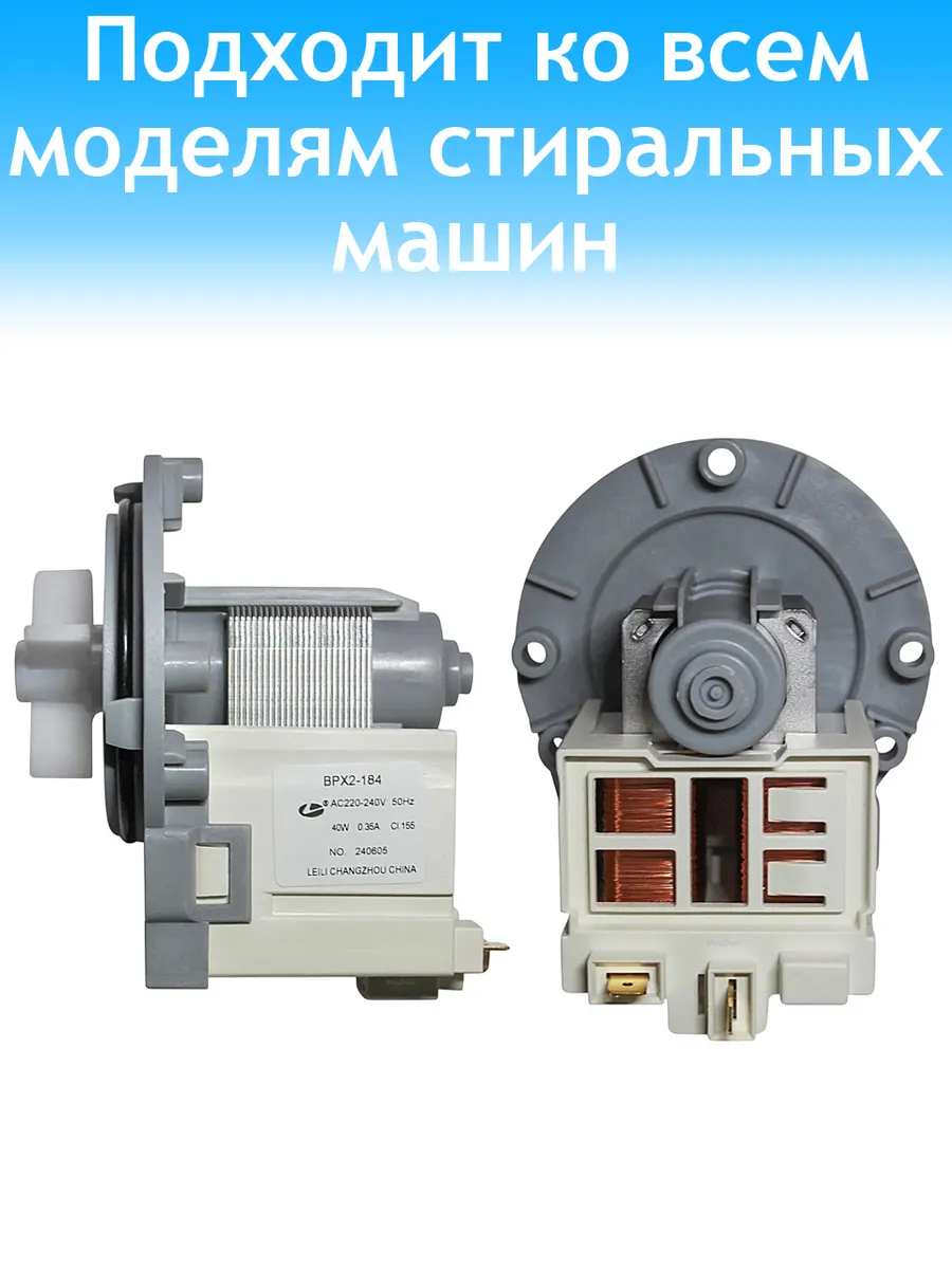 К стиральной машине подключается 2-мя раздельными контактами, которые находятся на задней стороне насоса. Данная помпа является универсальной и устанавливается в большое количество моделей стиральных машин. Маркировка: LEILI, BPX2-184, C00301531, 48800301531, NO 240605.
