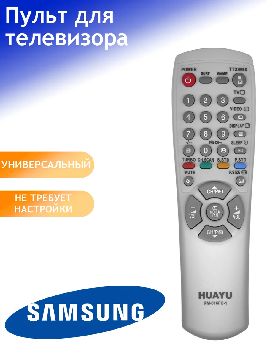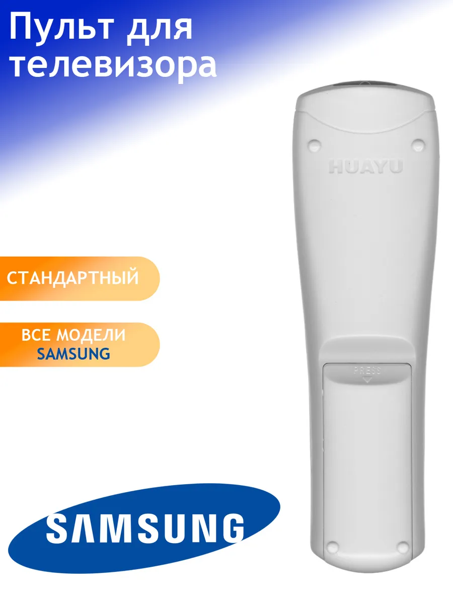 Оригинальный пульт для телевизора Samsung от бренда Huayu — универсальный пульт дистанционного управления, подходящий для всех телевизоров Samsung. Быстрая и простая замена штатного пульта: управление каналами, громкостью, навигация по меню.