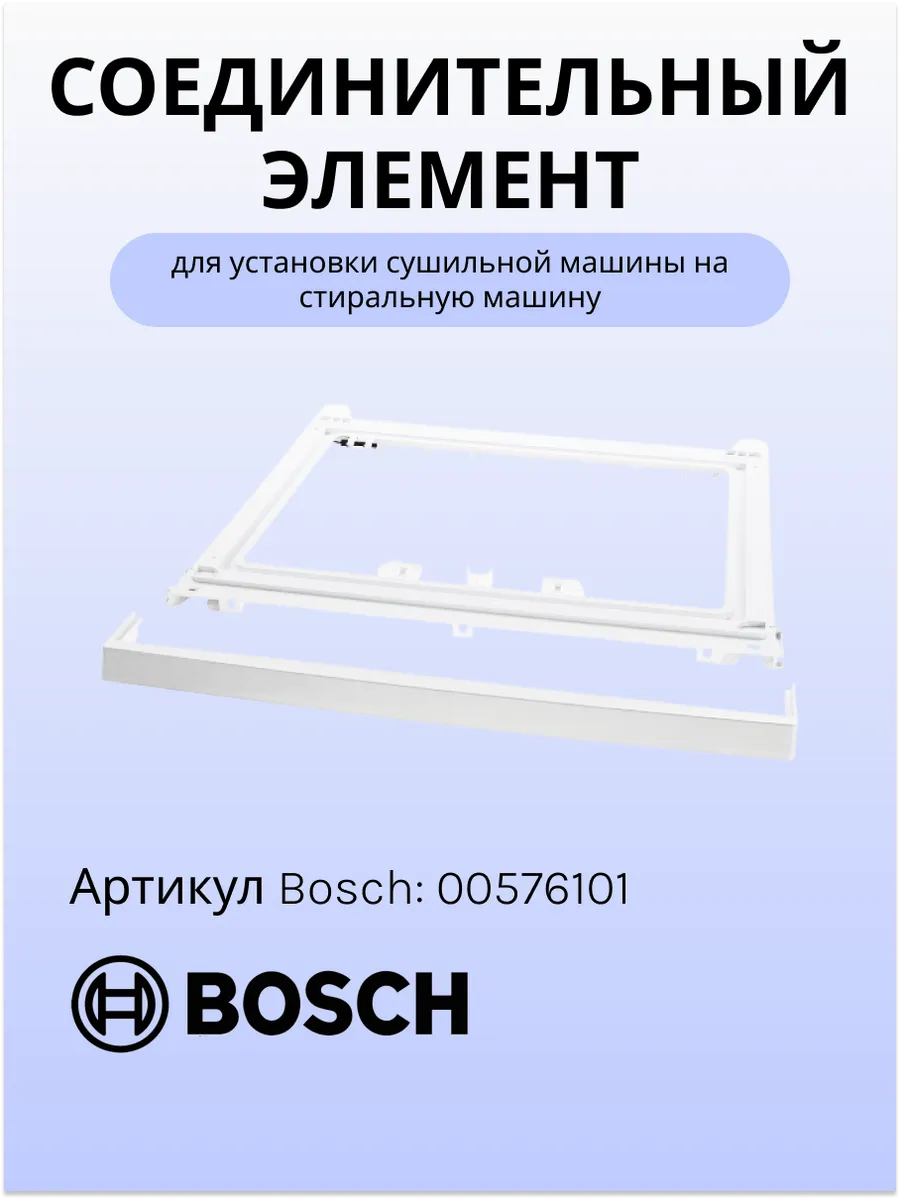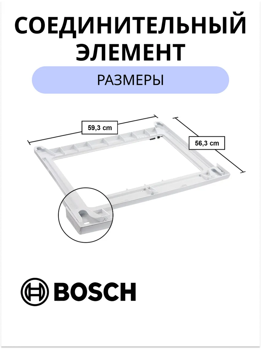 Для соединения полноразмерной стиральной машины и сушильного аппарата серии WTB.., WTG.., WTH.., WTW.., WTY.., WT..W.., WT..H.., WT..B.., WT..M.., WT..Y..: WTB66211OE, WTB86211OE, WTB86200OE, WTG86400OE, WTH83000OE, WTH83200OE, WTW83460OE, WTW85460OE, WTW85560OE, WTY87780OE, WT43W460OE, WT45H200OE, WT45M260OE, WT45W460OE, WT45W461OE, WT45W560OE, WT45W561OE, WT46B211OE, WT47Y780OE, WT47Y781OE, WT47Y782OE, WT48Y780OE, WT66B211OE. Соединительный элемент Bosch – это специальное устройство, позволяющее компактно установить сушильную машину Bosch поверх стиральной машины Bosch, экономя место на кухне или в ванной комнате. Компактность: Позволяет установить сушильную машину на стиральную машину, экономя пространство. Устойчивость: Обеспечивает надежное и устойчивое соединение между двумя машинами, предотвращая вибрации и смещение.