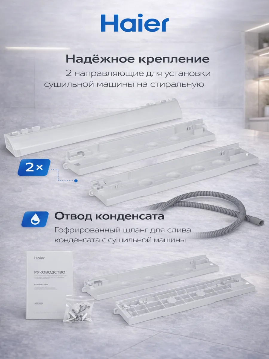 Оригинальный соединительный комплект Haier CK-3 предназначен для надежной установки сушильной машины на стиральную в колонну. Решение позволяет значительно сэкономить пространство в ванной комнате или прачечной, обеспечивая устойчивость техники и безопасную эксплуатацию.