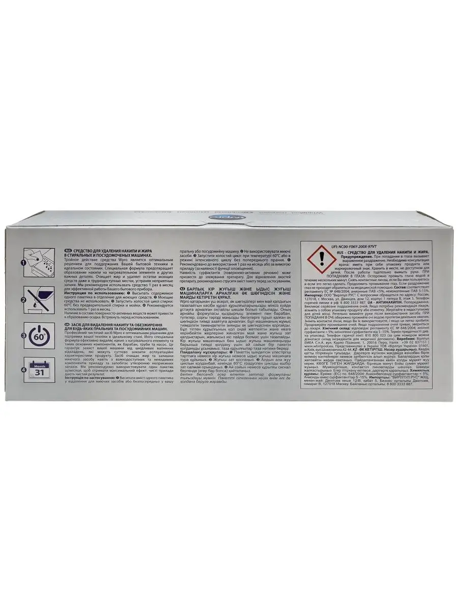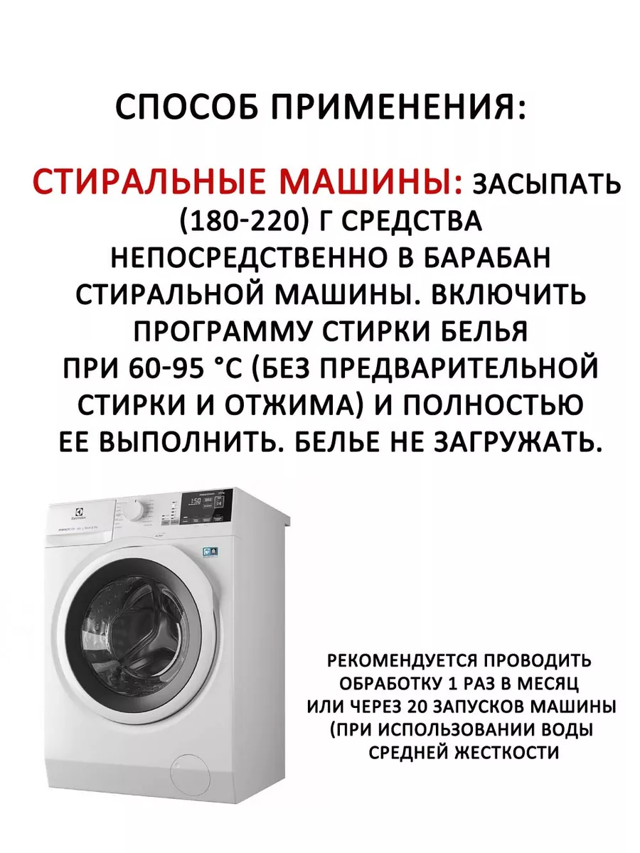 Инструкция по использованию: 1) Высыпать содержимое одного пакетика в отделение для моющих средств. 2) Моющие средства не использовать. 3) Запустить цикл стирки: 60 °C без предварительной стирки и мойки. 4) Рекомендуется использовать 1 раз в месяц.