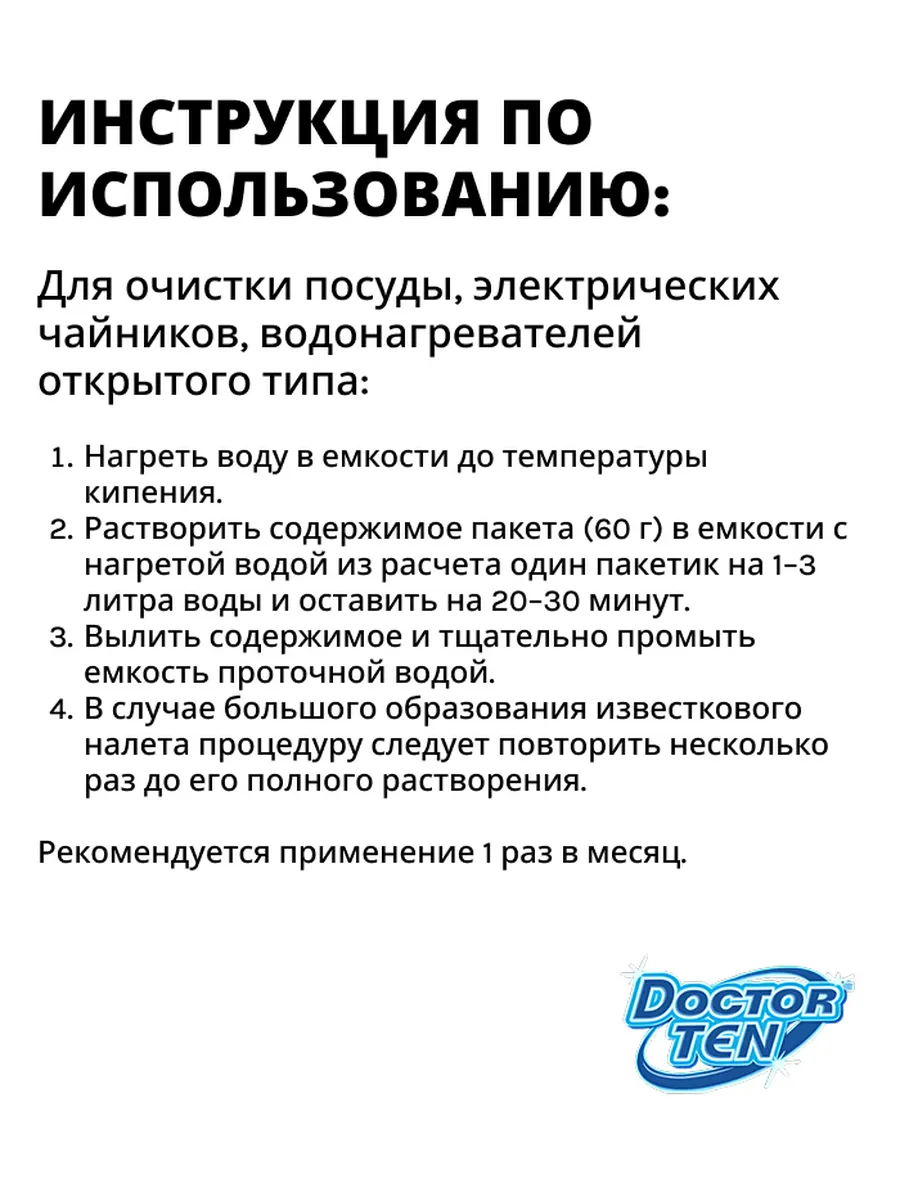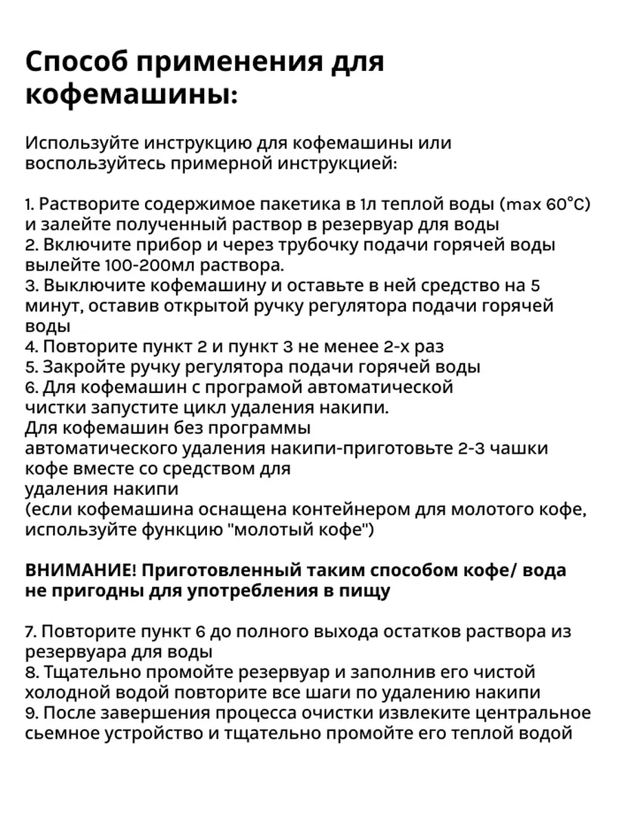 Средство для удаления накипи универсальное Доктор Тэн. ИНСТРУКЦИЯ ПО ИСПОЛЬЗОВАНИЮ: Для очистки посуды, электрических чайников, водонагревателей открытого типа: Нагреть воду в емкости до температуры кипения. Растворить содержимое пакета (60 г) в емкости с нагретой водой из расчета один пакетик на 1–3 литра воды и оставить на 20–30 минут. Вылить содержимое и тщательно промыть емкость проточной водой. В случае большого образования известкового налета процедуру следует повторить несколько раз до его полного растворения. Рекомендуется применение 1 раз в месяц. Способ применения для кофемашины: Используйте инструкцию для кофемашины или воспользуйтесь примерной инструкцией: 1. Растворите содержимое пакетика в 1л теплой воды (max 60°C) и залейте полученный раствор в резервуар для воды 2. Включите прибор и через трубочку подачи горячей воды вылейте 100-200мл раствора. 3. Выключите кофемашину и оставьте в ней средство на 5 минут, оставив открытой ручку регулятора подачи горячей воды 4. Повторите пункт 2 и пункт 3 не менее 2-х раз 5. Закройте ручку регулятора подачи горячей воды 6. Для кофемашин с програмой автоматической чистки запустите цикл удаления накипи. Для кофемашин без программы автоматического удаления накипи-приготовьте 2-3 чашки кофе вместе со средством для удаления накипи (если кофемашина оснащена контейнером для молотого кофе, используйте функцию "молотый кофе") ВНИМАНИЕ! Приготовленный таким способом кофе/ вода не пригодны для употребления в пищу 7. Повторите пункт 6 до полного выхода остатков раствора из резервуара для воды 8. Тщательно промойте резервуар и заполнив его чистой холодной водой повторите все шаги по удалению накипи 9. После завершения процесса очистки извлеките центральное сьемное устройство и тщательно промойте его теплой водой Тэги: Доктор Тэн, Doctor TEN, ДокторТэн, Dr. Ten, антинакипин, средство от накипи, удаление накипи, очистка от извести, известковый налет, удаление солей, против накипи, чистка ТЭНа, защита от накипи