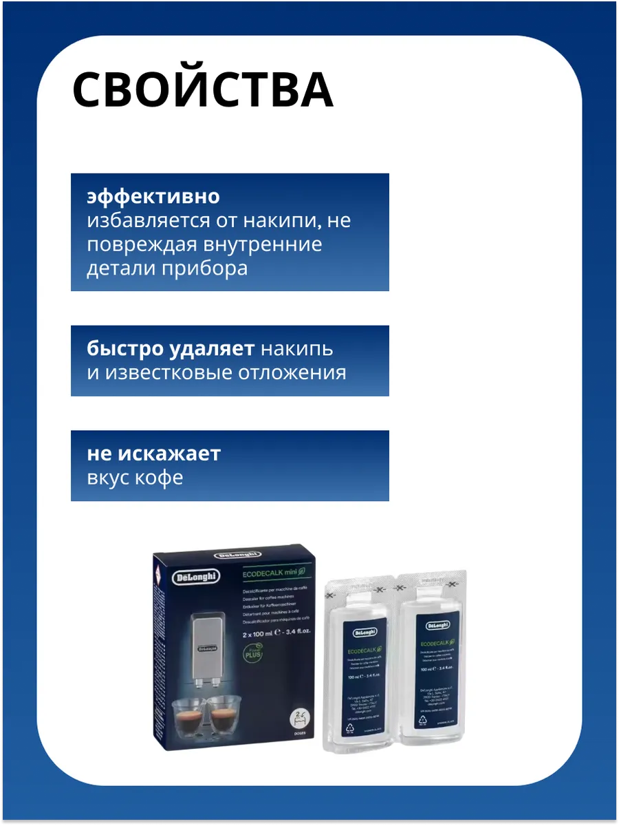DeLonghi EcoDecalk — это эффективное и экологичное средство для удаления накипи, специально разработанное для кофемашин DeLonghi. Формула на основе натуральных кислот бережно, но эффективно удаляет накипь, продлевая срок службы вашей кофемашины и гарантируя безупречное качество напитков.
