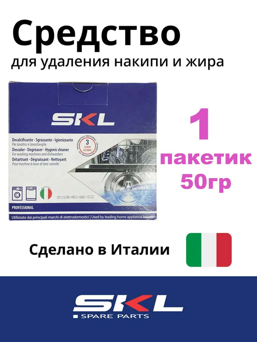 Средство от накипи для стиральных и посудомоечных машин SKL Professional. Является аналогом WPRO от накипи. C00384875, 4840 0000 8810, 4840 0000 8815, 55401340, DET102ZN, DET100ZN, 35601768. Каждый день на внутренних деталях Вашей техники в процессе эксплуатации оседает накипь. Данное соединение уменьшает функциональность техники, оксида на ТЭНе (нагревательном приборе), помпе и т.д , а так-же даже может привести к поломке. Для того чтобы этого не произошло необходимо систематически чистить технику. Одно из качественных и безопасных средств является средство от накипи для стиральных и посудомоечных машин SKL. Данный профессиональный очиститель , кроме полного разрушения вредного известняка, дезинфицирует внутреннюю часть прибора, а так же очищает его от любых загрязнений, избавляет от плесени и неприятных запахов, таким образом Ваш прибор будет в идеальном состоянии. В упаковке 1 пакетик, хватит на одно использование. Способ применения: 1). Стиральная машина: Вылейте, содержимое одного пакетика в барабан стиральной машины и начните цикл стирки при температуре 60С, исключая предварительной стирки. Не добавляйте моющие средства или одежду для стирки. 2). Посудомоечная машина: Вылейте половину одного пакетика в дозатор моющих средств начните цикл мытья при температуре 60С. Примерно через пол часа, аккуратно откройте посудомоечную машину и добавьте вторую половину содержимого пакетика на дно. Завершить цикл мытья. Посудомоечная машина должна быть пустой и без моющих средств во время обработки. Рекомендуется применять 1 раз в месяц.