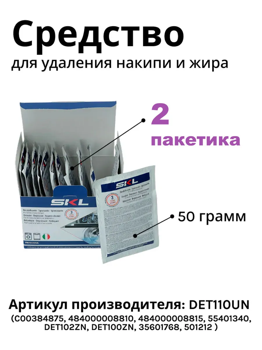 Средство от накипи для стиральных и посудомоечных машин SKL Professional. Является аналогом WPRO от накипи. C00384875, 4840 0000 8810, 4840 0000 8815, 55401340, DET102ZN, DET100ZN, 35601768. Каждый день на внутренних деталях Вашей техники в процессе эксплуатации оседает накипь. Данное соединение уменьшает функциональность техники, оксида на ТЭНе (нагревательном приборе), помпе и т.д , а так-же даже может привести к поломке. Для того чтобы этого не произошло необходимо систематически чистить технику. Одно из качественных и безопасных средств является средство от накипи для стиральных и посудомоечных машин SKL. Данный профессиональный очиститель , кроме полного разрушения вредного известняка, дезинфицирует внутреннюю часть прибора, а так же очищает его от любых загрязнений, избавляет от плесени и неприятных запахов, таким образом Ваш прибор будет в идеальном состоянии. В упаковке 2 пакетикаа, хватит на два использования. Способ применения: 1). Стиральная машина: Вылейте, содержимое одного пакетика в барабан стиральной машины и начните цикл стирки при температуре 60С, исключая предварительной стирки. Не добавляйте моющие средства или одежду для стирки. 2). Посудомоечная машина: Вылейте половину одного пакетика в дозатор моющих средств начните цикл мытья при температуре 60С. Примерно через пол часа, аккуратно откройте посудомоечную машину и добавьте вторую половину содержимого пакетика на дно. Завершить цикл мытья. Посудомоечная машина должна быть пустой и без моющих средств во время обработки. Рекомендуется применять 1 раз в месяц.