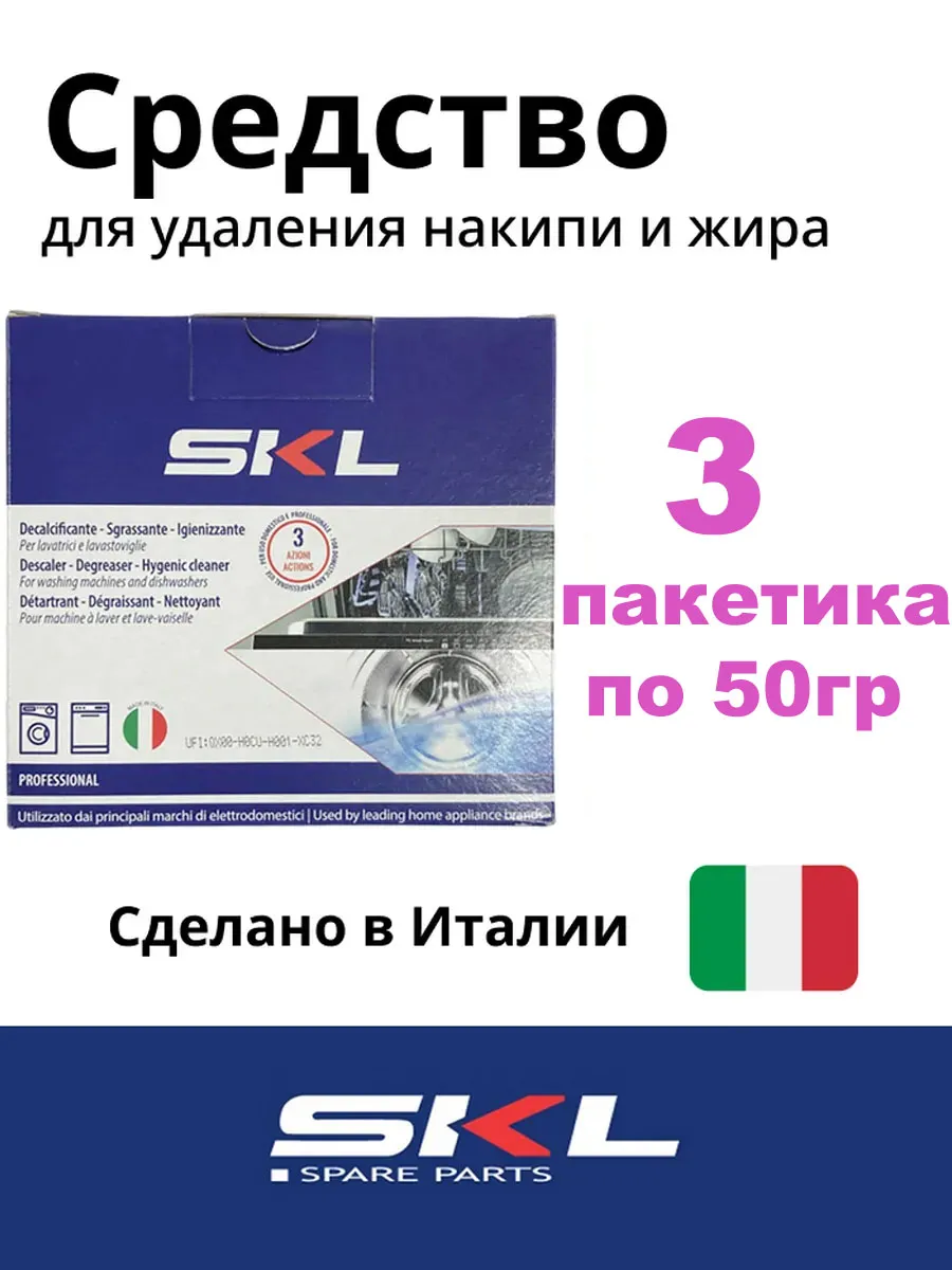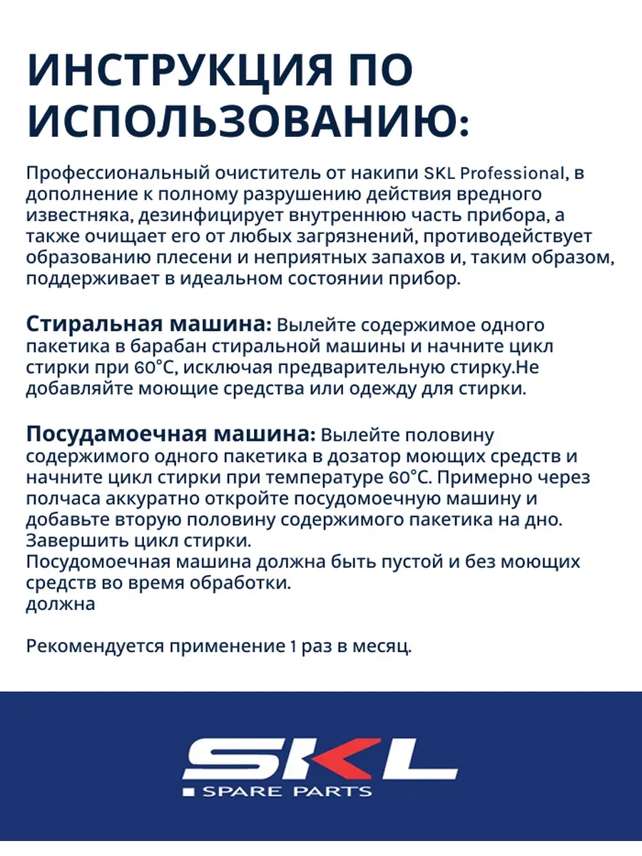 Средство от накипи для стиральных и посудомоечных машин SKL Professional. Является аналогом WPRO от накипи. C00384875, 4840 0000 8810, 4840 0000 8815, 55401340, DET102ZN, DET100ZN, 35601768. Каждый день на внутренних деталях Вашей техники в процессе эксплуатации оседает накипь. Данное соединение уменьшает функциональность техники, оксида на ТЭНе (нагревательном приборе), помпе и т.д , а так-же даже может привести к поломке. Для того чтобы этого не произошло необходимо систематически чистить технику. Одно из качественных и безопасных средств является средство от накипи для стиральных и посудомоечных машин SKL. Данный профессиональный очиститель , кроме полного разрушения вредного известняка, дезинфицирует внутреннюю часть прибора, а так же очищает его от любых загрязнений, избавляет от плесени и неприятных запахов, таким образом Ваш прибор будет в идеальном состоянии. В упаковке 3 пакетиков, хватит на три использования. Способ применения: 1). Стиральная машина: Вылейте, содержимое одного пакетика в барабан стиральной машины и начните цикл стирки при температуре 60С, исключая предварительной стирки. Не добавляйте моющие средства или одежду для стирки. 2). Посудомоечная машина: Вылейте половину одного пакетика в дозатор моющих средств начните цикл мытья при температуре 60С. Примерно через пол часа, аккуратно откройте посудомоечную машину и добавьте вторую половину содержимого пакетика на дно. Завершить цикл мытья. Посудомоечная машина должна быть пустой и без моющих средств во время обработки. Рекомендуется применять 1 раз в месяц.