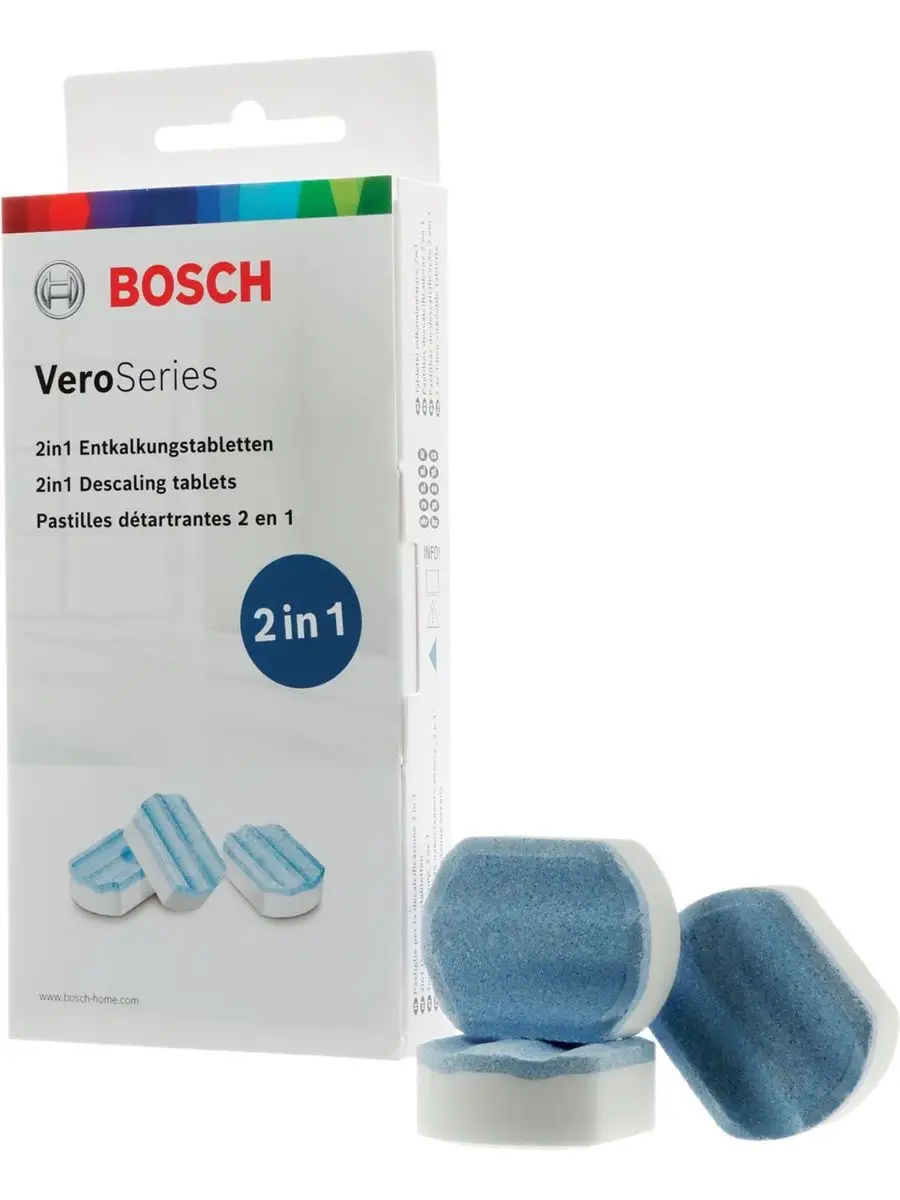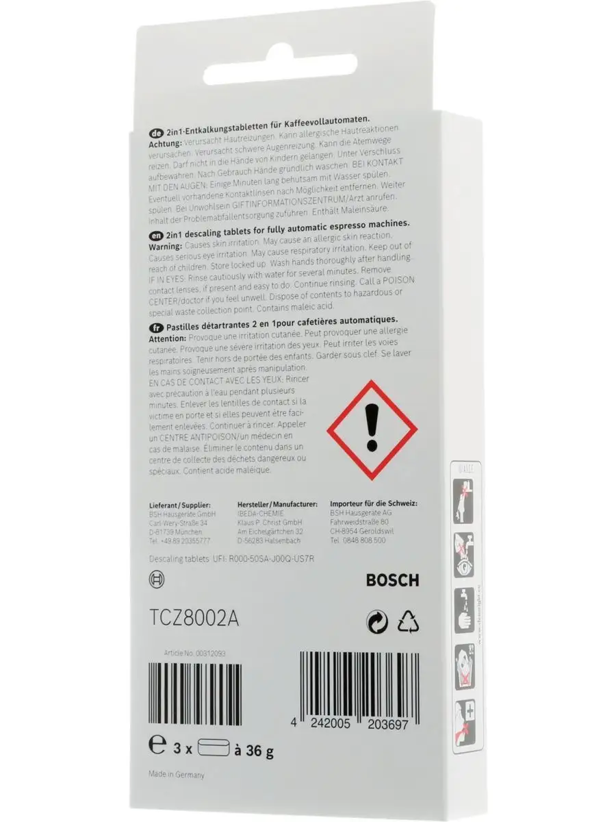 Таблетки от накипи для кофемашин и кофе-автоматов Bosch. Эффект "2 в 1": очистка от накипи + защита от коррозии. Увеличенный срок службы прибора благодаря оптимальной защите от накипи. Упаковка содержит 3 таблетки по 36 грамм (на 3 использования). Разработаны для автоматических программ очистки кофемашин Bosch. Производится под кодам завода изготовителя 00312093, 00576694, TCZ8002A. Сделано в Германии. Состав: Лимонная кислота, обезвоженный, Малеиновая кислота, Сульфамидная кислота, Гидрогенкарбонат натрия, Тетранатрий (1-гидроксиэтилиден)бисфосфонат, Сульфат натрия обезвоженный, Вода, Sanolin.