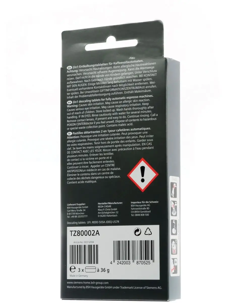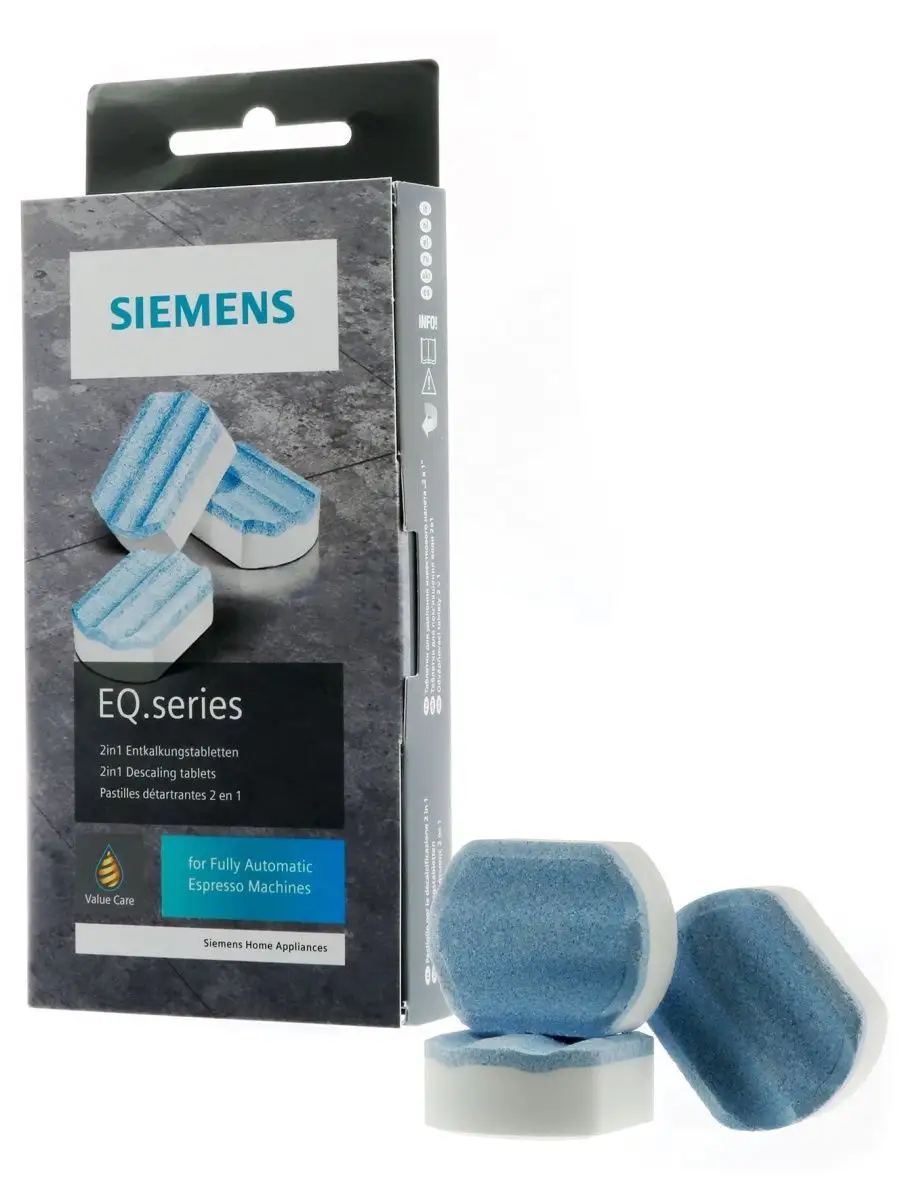 Таблетки от накипи для кофемашин Siemens 00312094 TZ80002, 3 шт. Увеличенный срок службы кофемашины благодаря оптимальной защите от накипи Эффект "2 в 1": очистка от накипи + защита от коррозии. Подходят для полностью автоматических кофемашин эспрессо серий EQ, а также встраиваемых кофемашин. Упаковка содержит 3 таблетки по 36 грамм (на 3 использования). Соответствует аксессуару: TZ80002A. Оптимальны для использования в автоматических программах очистки кофемашин. Состав: Лимонная кислота 45-55%, Малеиновая кислота 15-25%, Сульфамидная кислота 10-20%.