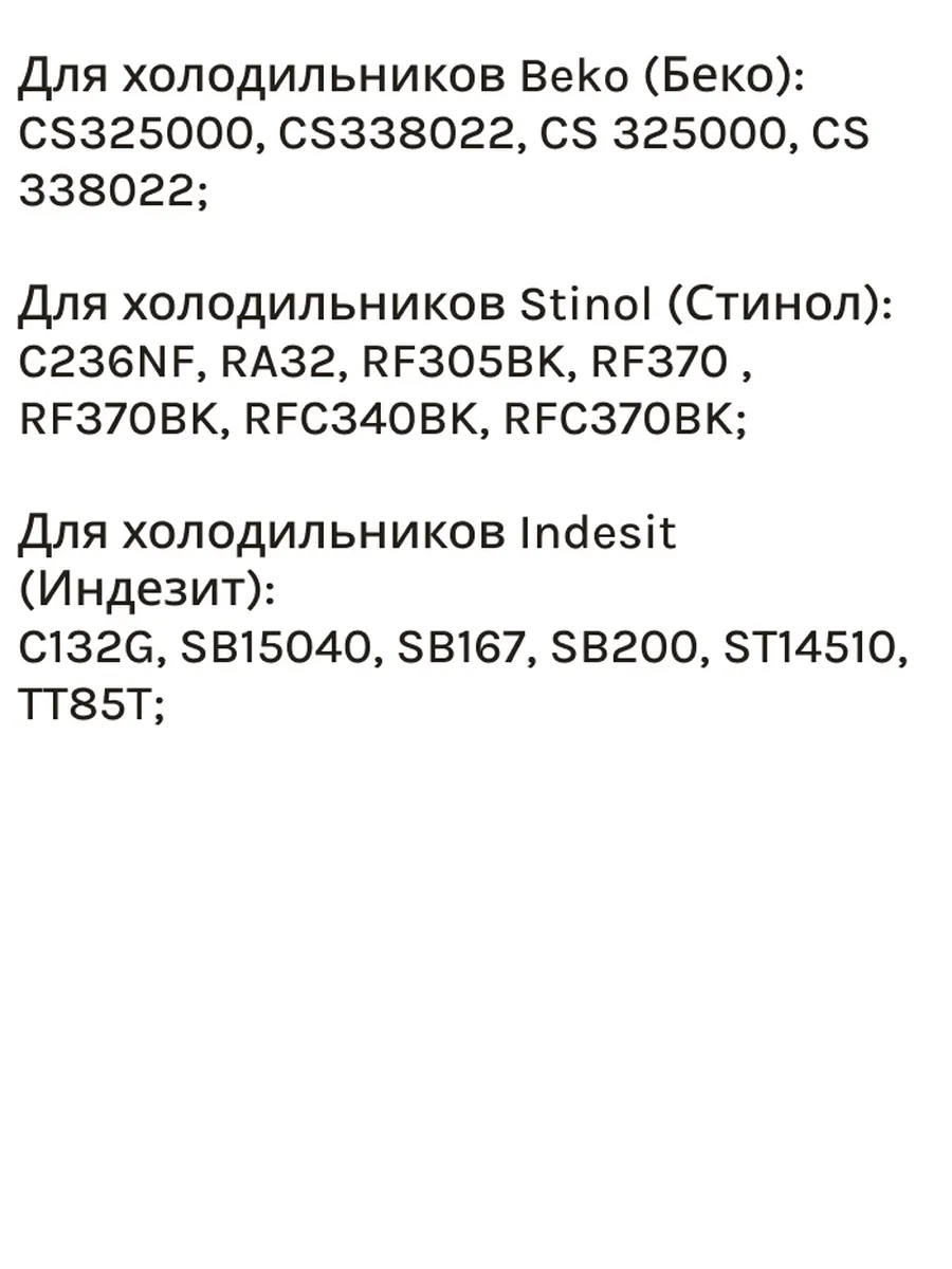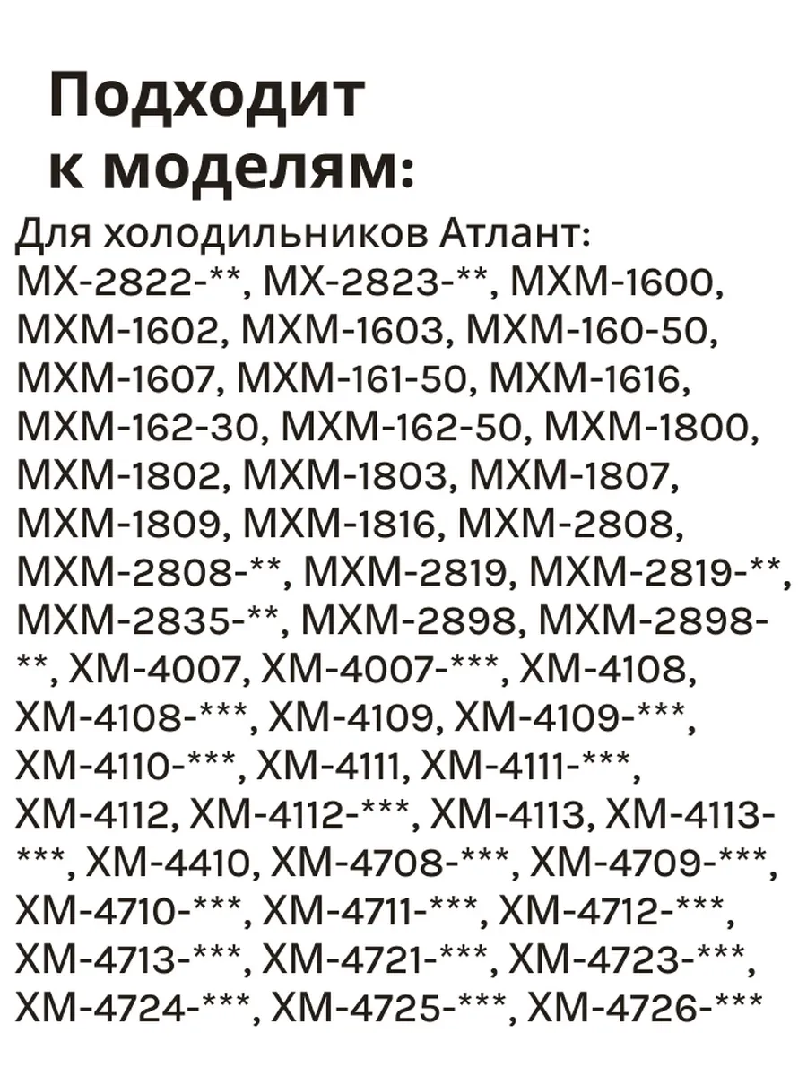 Для холодильников Атлант: МХ-2822-**, МХ-2823-**, МХМ-1600, МХМ-1602, МХМ-1603, МХМ-160-50, МХМ-1607, МХМ-161-50, МХМ-1616, МХМ-162-30, МХМ-162-50, МХМ-1800, МХМ-1802, МХМ-1803, МХМ-1807, МХМ-1809, МХМ-1816, МХМ-2808, МХМ-2808-**, МХМ-2819, МХМ-2819-**, МХМ-2835-**, МХМ-2898, МХМ-2898-**, ХМ-4007, ХМ-4007-***, ХМ-4108, ХМ-4108-***, ХМ-4109, ХМ-4109-*** ХМ-4110-***, ХМ-4111, ХМ-4111-***, ХМ-4112, ХМ-4112-***, ХМ-4113, ХМ-4113-***, ХМ-4410, ХМ-4708-***, ХМ-4709-***, ХМ-4710-***, ХМ-4711-***, ХМ-4712-***, ХМ-4713-***, ХМ-4721-***, ХМ-4723-***, ХМ-4724-***, ХМ-4725-***, ХМ-4726-***, КШД-126-1 300/60, КШД-150-* 300/60, КШД-151-** 300/115, КШД-152-** 330/115, МХМ-1600-** КШД 340-80, МХМ-1602-** КШД 340-80, МХМ-1603-** КШД 290/80, МХМ-160-50 КШД 250-80, МХМ-1607-** КШД 290/115, МХМ-161-50 КШД 300/115, МХМ-1616-** КШД 301-80, МХМ-162-30 КШД 300/115, МХМ-162-50 КШД 330/115, MX-2822-**, MX-2823-**, MXM-1600, MXM-1602, MXM-1603, MXM-160-50, MXM-1607, MXM-161-50, MXM-1616, MXM-162-30, MXM-162-50, MXM-1800, MXM-1802, MXM-1803, MXM-1807, MXM-1809, MXM-1816, MXM-2808, MXM-2808-**, MXM-2819, MXM-2819-**, MXM-2835-**, MXM-2898, MXM-2898-**, XM-4007, XM-4007-***, XM-4108, XM-4108-***, XM-4109, XM-4109-***, XM-4110-***, XM-4111, XM-4111-***, XM-4112, XM-4112-***, XM-4113, XM-4113-***, XM-4410, XM-4708-***, XM-4709-***, XM-4710-***, XM-4711-***, XM-4712-***, XM-4713-***, XM-4721-***, XM-4723-***, XM-4724-***, XM-4725-***, XM-4726-***, КШД-126-1 300/60, КШД-150-* 300/60, КШД-151-** 300/115, КШД-152-** 330/115, MXM-1600-** КШД 340-80, MXM-1602-** КШД 340-80, MXM-1603-** КШД 290/80, MXM-160-50 КШД 250-80, MXM-1607-** КШД 290/115, MXM-161-50 КШД 300/115, MXM-1616-** КШД 301-80Для холодильников Beko (Беко): CS325000, CS338022, CS 325000, CS 338022 Для холодильников Stinol (Стинол): C236NF, RA32, RF305BK, RF370 , RF370BK, RFC340BK, RFC370BK; Для холодильников Indesit (Индезит): C132G, SB15040, SB167, SB200, ST14510, TT85T