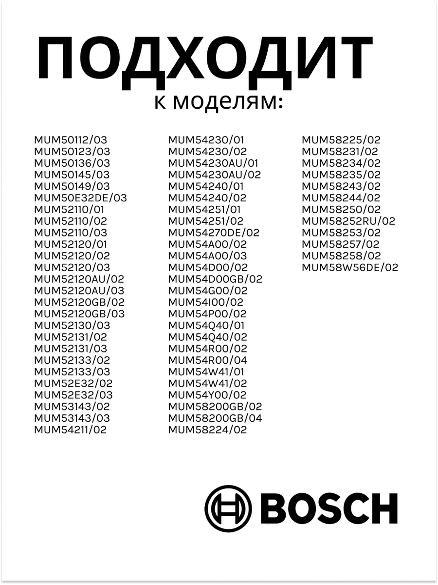 Совместимость: Подходит для большинства моделей кухонных комбайнов Bosch с функцией блендера.